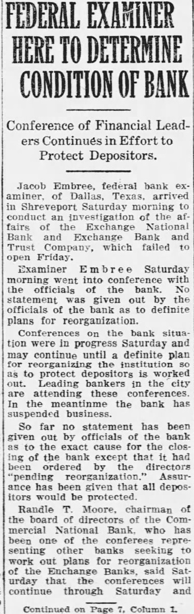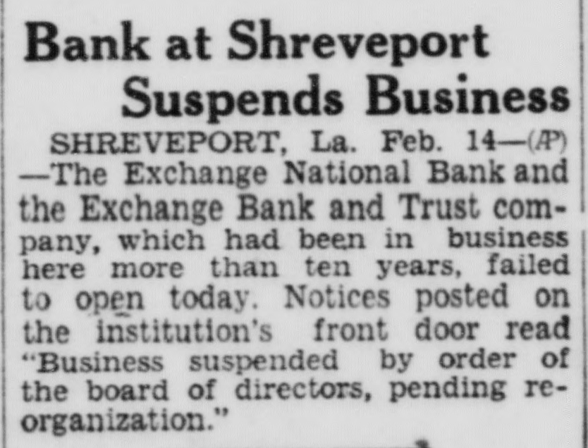Shreveport Bank Closes Shreveport, La., Feb. The Exchange National Bank and MRS. The Exchange Bank and Trust company failed to open here. While official statement has been issuby officers of the two institutions, is believed the the banks home solvent and have been closed purposes.
