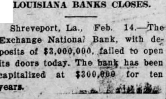LOUISIANA BANKS CLOSES. Shreveport, Feb. Exchange National Bank, with posits failed to its doors today. bank been capitalized for