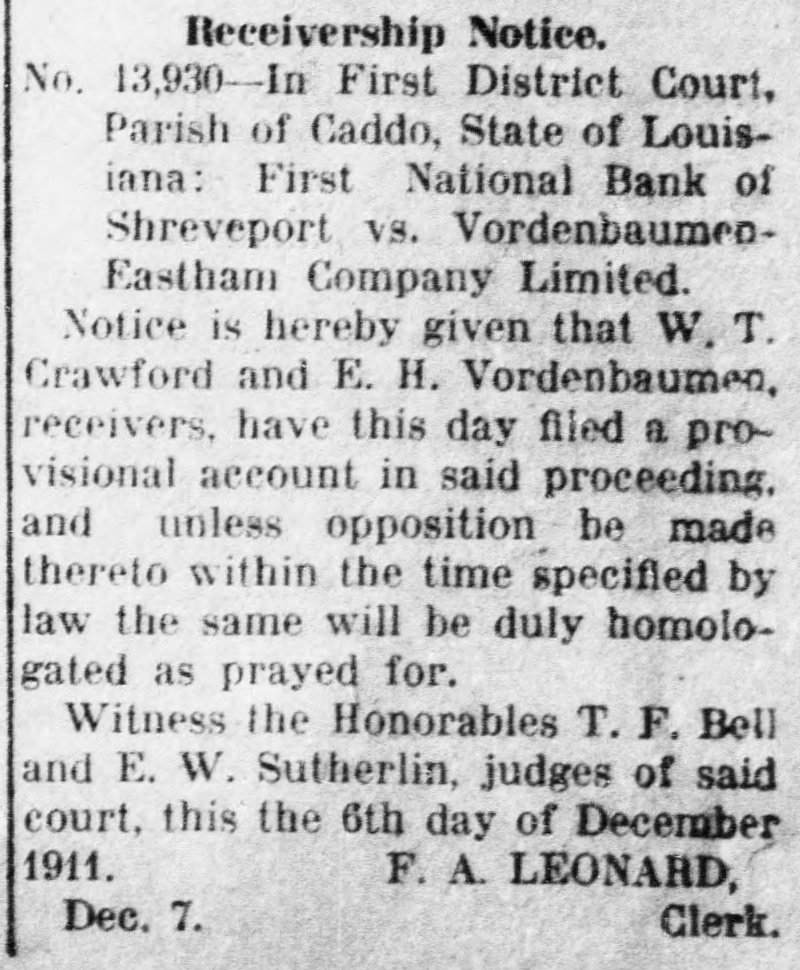 Receivership Notice. No. 13,930-In First District Court, Parish of Caddo, State of Louisiana: First National Bank of Shreveport vs. VordenbaumenEastham Company Limited. Notice is hereby given that W. T. Crawford and E. H. Vordenbaumen, receivers, have this day filed a provisional account in said proceeding. and unless opposition be made thereto within the time specified by law the same will be duly homologated as prayed for. Witness the Honorables T. F. Bell and E. W. Sutherlin, judges of said court, this the 6th day of December 1911. F. A. LEONARD, Dec. 7. Clerk.