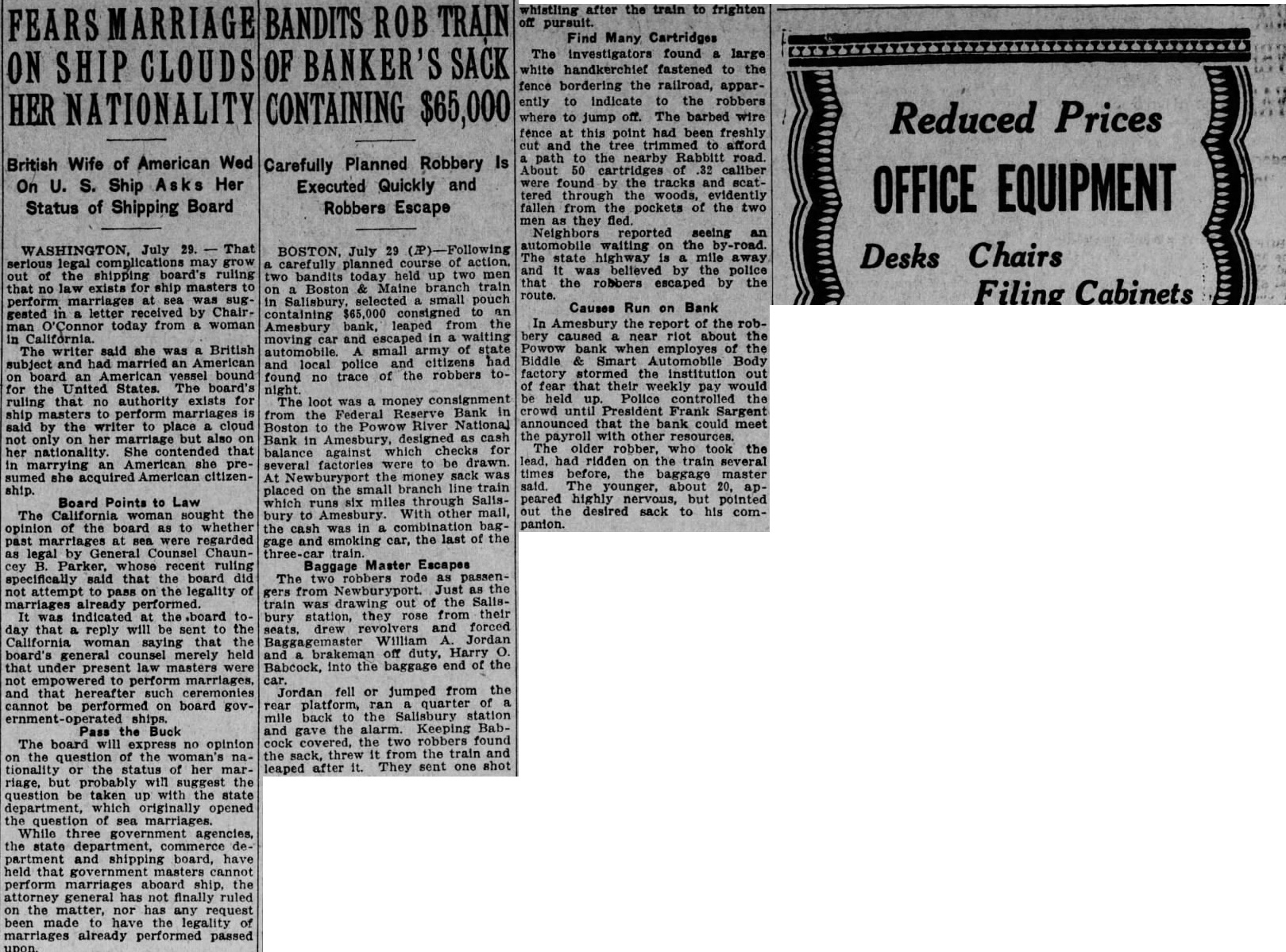 FEARS MARRIAGE BANDITS ROB TRAIN ON SHIP CLOUDS OF BANKER'S SACK HER NATIONALITY CONTAINING $65,000 British Wife of American Wed On U. S. Ship Asks Her Status of Shipping Board WASHINGTON, July 29. That serious legal complicati may grow out of the shipping board's ruling that no law exists for ship masters to perform marriages at sea was sug gested in letter received by Chairman O'Çonnor today from a woman in The writer said she was a British subject and had married an American on board an American vessel bound for the United States. The board's ruling that no authority exists for ship masters to perform said by the writer to place cloud not only on her marriage but also on her nationality She contended that in marrying an American she presumed she acquired American citizenship. Board Points to Law The California sought the opinion of the board as to whether past marriages at sea were regarded as legal by General Counsel Chauncey B. Parker, whose recent ruling specifically said that the board did not attempt to pass on the legality of marriages already performed It was indicated at the .board today that reply will be sent to the California woman saying that the board's general counsel merely held that under law masters were and that hereafter such ceremonies cannot be performed on board government -operated ships. Pass the Buck The board will express no opinion on the question of the nationality or the status of her marriage, but probably will suggest the question be taken up with the state department, which originally opened the question of sea marriages. While three agencies, the state department, department and shipping board, have held that government masters cannot perform marriages aboard ship. the attorney general has not finally ruled on the matter, nor has any request been made have the legality of marriages already performed passed upon. Carefully Planned Robbery Is Executed Quickly and Robbers Escape BOSTON July 29 carefully planned course of action. two bandits today held up two men on Boston & Maine branch train in Salisbury, selected small pouch containing 000 consigned to Amesbury bank, leaped from the moving car and escaped in a waiting automobile small army of state and local police and citizens had found no trace of the robbers tonight. The loot was money consignment from the Federal Reserve Bank in Boston the Powow River National Bank in Amesbury, designed as cash balance against which checks for several factories were to be drawn At Newburyport the money sack was placed on the small branch line train which runs six through Salisbury to Amesbury With other mail, the cash was combination baggage and smoking car, the last of the three-car Baggage Master Escapes The two robbers rode as gers from Newbury Just as the train was drawing out of the Salisbury station, they rose from their seats. drew revolvers and forced Baggagemaster William Jordan and brakeman off duty, Harry O. Babcock, into the baggage end of the car. Jordan fell or jumped from the rear platform, ran quarter of mile back to the Salisbury station and gave the alarm Keeping Babcock the two robbers found the sack, from the train and leaped after it. They sent one shot whistling after the train to frighten off pursuit. Find Many Cartridges The investigators found a large white handkerchief fastened to the fence bordering the railroad, apparently to Indicate to the robbers where to jump off. The barbed wire Reduced Prices fence at this point had been freshly cut and the tree to afford path to the nearby Rabbitt road About 50 cartridges .32 caliber were found by the tracks and scat OFFICE EQUIPMENT tered through the woods, evidently fallen from the pockets of the two men as they Neighbors reported seeing an automobile waiting on the by-road. Desks Chairs The state highway is a mile away and It was believed by the police that the robbers escaped by the route. Filing Cabinets Causes Run on Bank In Amesbury the report of the robbery caused near riot about the Powow bank when employes of the Biddle & Smart Automobile Body factory stormed the institution out of fear that their weekly pay would be held up. Police the crowd until President Frank Sargent announced that the bank could meet the payroll with other resources. older robber, who took the lead. had ridden on the train several times the baggage master said. The younger, about 20, ap. peared highly nervous, but pointed out the desired sack to his com-
