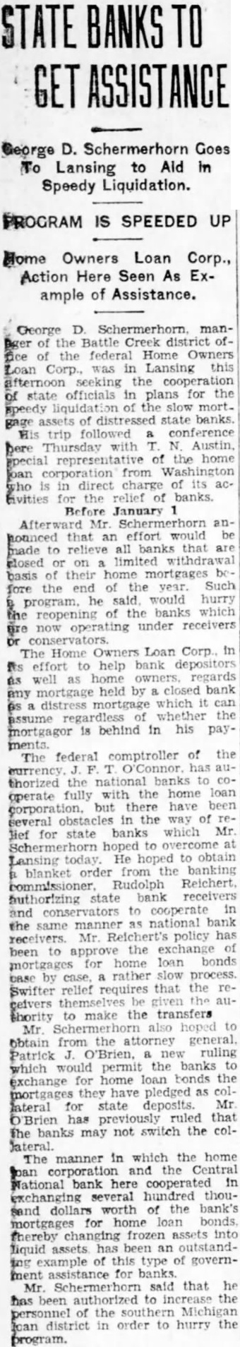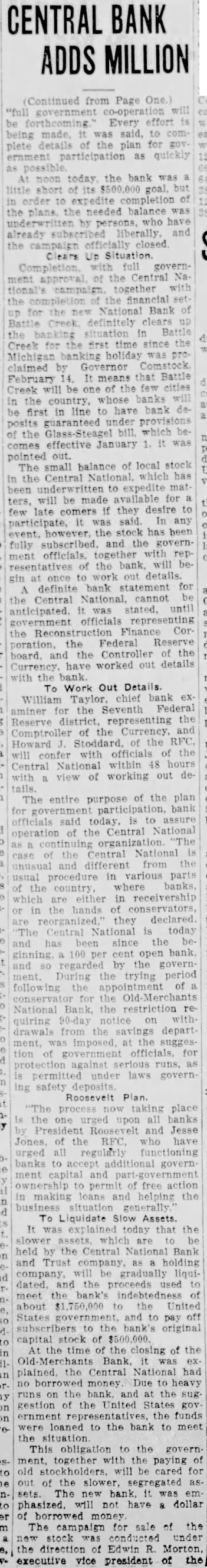 (Continued from Page will government Every effort being made, was said, to plete details of the plan for ernment participation as quickly possible At noon today the bank was short of its goal, but order expedite of to the plans. the needed balance was by persons, who have already and the closed. Clears Up Situation with full the Central ment together with tional's the for the National Bank Battle Creek definitely clears situation Battle the Creek for the first time since the Michigan banking holiday was claimed Governor that Battle February means Creek will be one of few cities the whose banks first in line to have bank posits guaranteed under provisions which the comes effective January pointed out. balance of local stock The small Central which has the to expedite mat been will be made available for ters, they desire to few late comers was said. In any participate, stock has been however, fully subscribed, and the governtogether with ment resentatives of the bank, will begin at once work out details. definite bank statement for the Central cannot anticipated. was stated, until government officials representing the Reconstruction Finance Cor the Federal Reserve poration, board. and the Controller the Currency. have worked out details the To Work Out Details William Taylor. chief bank aminer for the Seventh Federal Reserve district, representing the Comptroller of the Currency. and Howard Stoddard of the RFC will confer with officials the Central National within 48 hours of working out deview The entire purpose of the plan for bank officials said today, assure operation of the Central National "The continuing Central National the unusual and different from the usual procedure in various parts the where which are either in receivership in hands of conservators, reorganized, they declared. Central National is today and has been since the ginning. 100 per cent open bank and regarded by the government. During the trying period following appointment of for the National Bank, the restriction 90-day notice withquiring drawals from the savings imposed, at the sugges. tion of officials, for against serious runs, permitted under laws governsafety deposits
