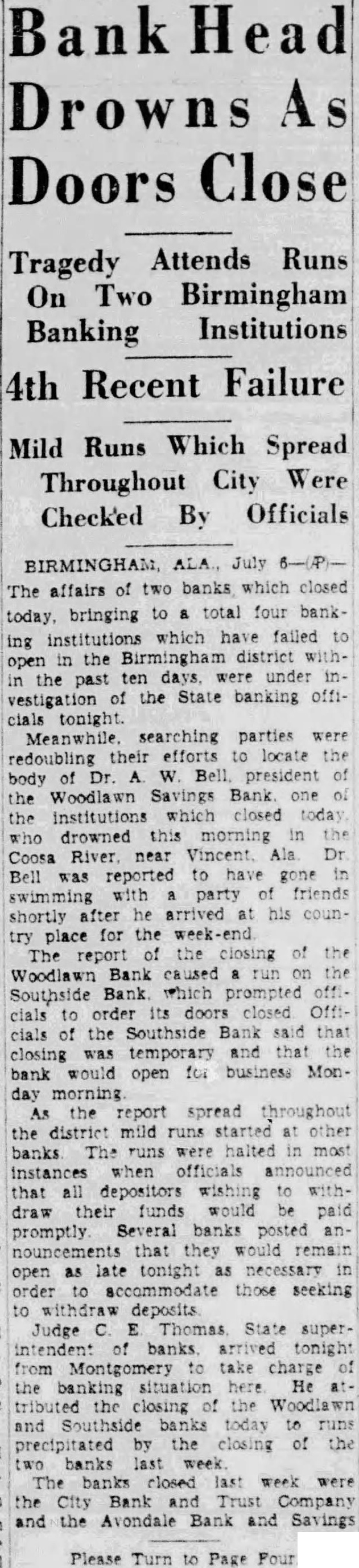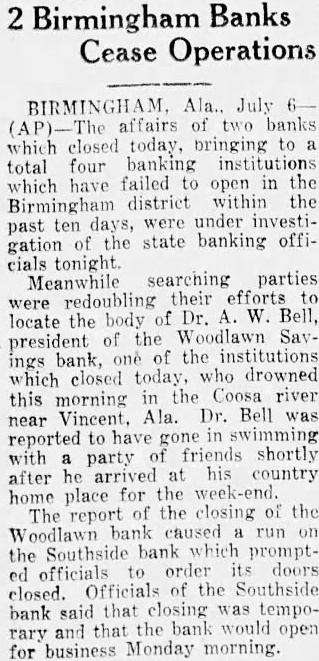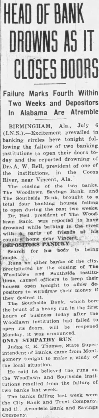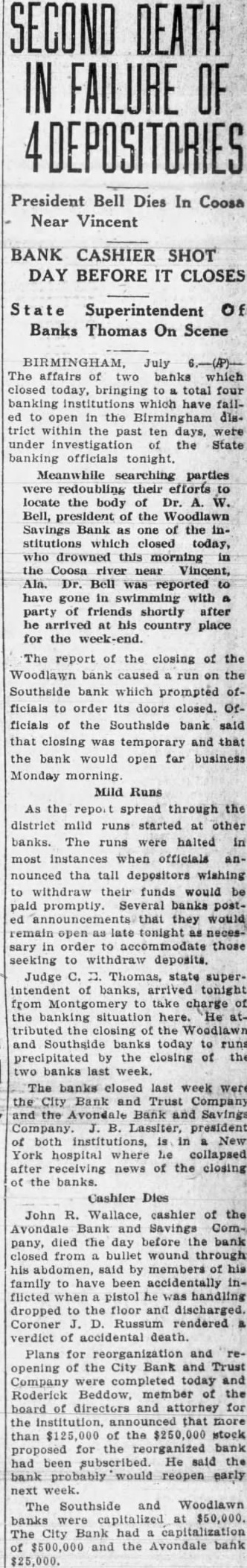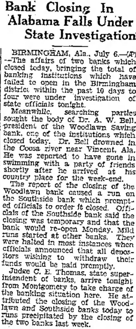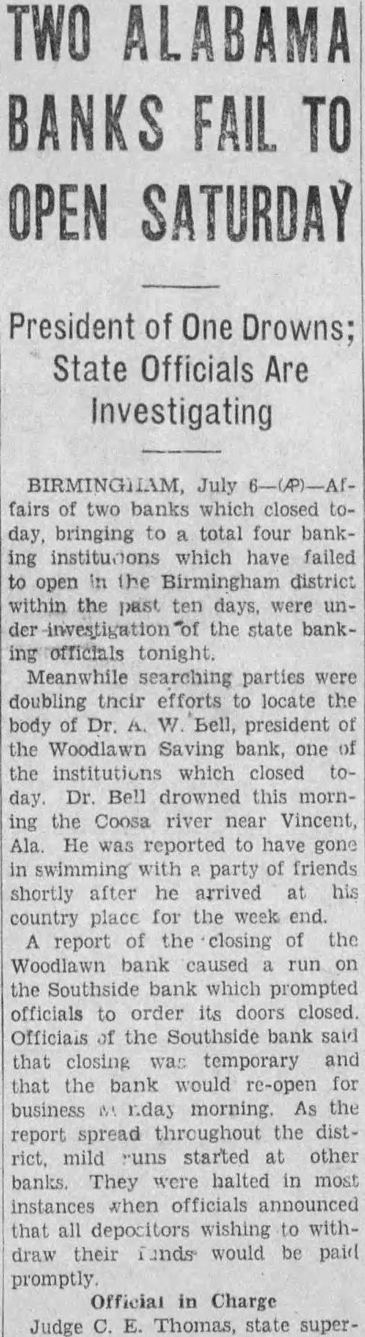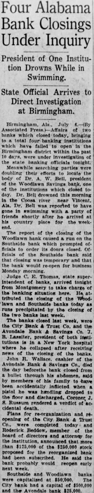 SEEK BODY OF BANKER. President of Woodlawn Savings Drowns While Swimming. BIRMINGHAM, Ala., July 6 (AP).-Affairs of two banks, which closed today, bringing to a total of four banking institutions which have failed to open in the Birmingham district within the past 10 days, were under investigation of the State banking officials tonight. Meanwhile, searching parties were doubling their efforts to locate the body of Dr. A. W. Bell, president of the Woodlawn Savings Bank, one of the institutions which closed today. Dr. Bell drowned this morning in the Coosa River, near Vincent, Ala. Dr. Bell was reported to have gone in swimming with a party of friends shortly after he arrived at his country place for the week end. Starts Run on Another Bank. The report of the closing of the Woodlawn Bank caused a run on the Southside Bank, which prompted offcials to order its doors closed. Officials of the Southside Bank said that closing was temporary and that the bank would re-open for business Monday morning. As the report spread throughout the district, mild runs started at other banks. The runs were halted in most instances when officials announced that all depositors wishing to withdraw their funds would be paid promptly. Judge C. E. Thomas, State superintendent of banks, arrived tonight from Montgomery, to take charge of the banking situation here. He attributed the closing of the Woodlawn and Southside Banks today to runs precipitated by the closing of the two banks last week. President of Bank Collapses. The banks closed last week were the City Bank & Trust Co. and the Avondale Bank & Savings Co. J. B. Lassiter, president of both institutions, is in a New York hospital, where he collapsed after receiving news of the closing of the banks. John R. Wallace, cashier of the Avondale Bank & Savings Co., died the day before the bank closed, from a bullet through his abdomen, said by members of his family to have been accidentally inflicted when a pistol he was handling dropped to the floor and discharged. (Continued on Page 2, Column 5.)