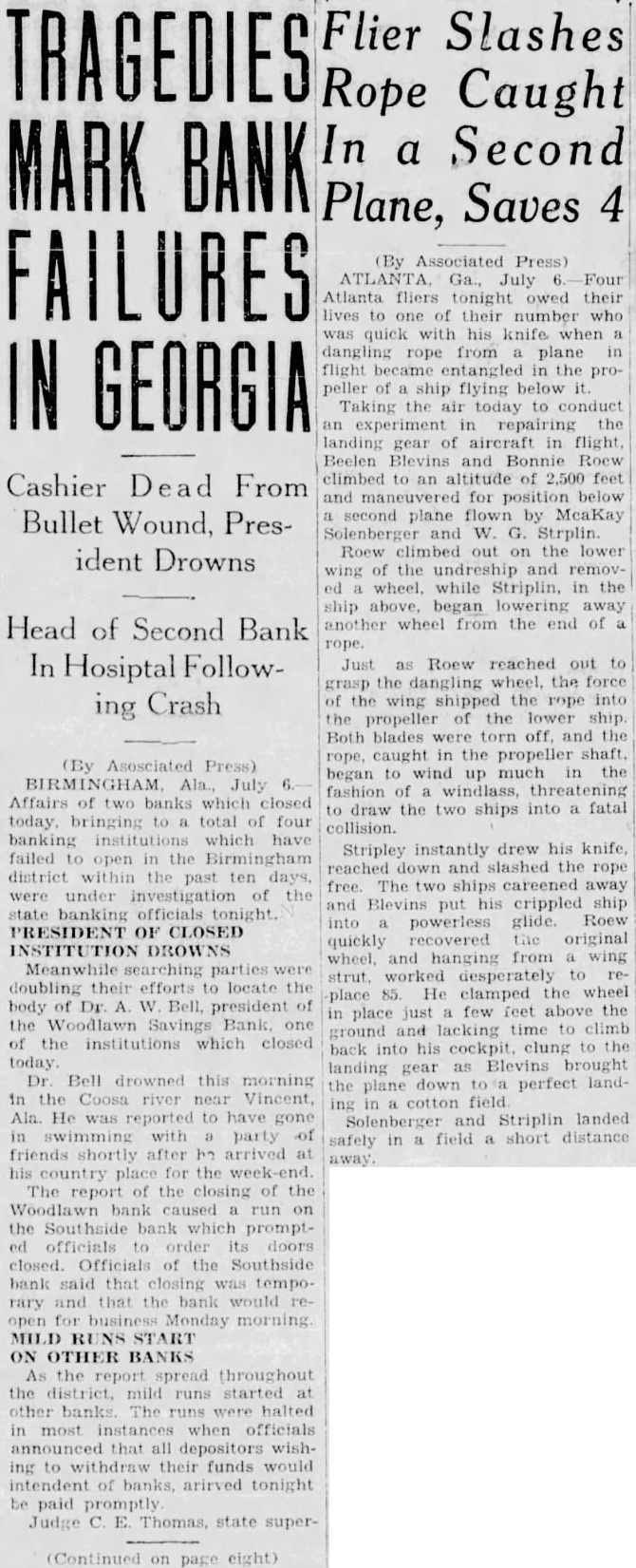 Flier Slashes TRAGEDIES Rope Caught In a Second MARK BANK Plane, Saves 4 (By Associated Press) FAILURES ATLANTA Ga., July Atlanta fliers tonight owed their lives to one of their number who was quick with his knife when dangling rope from plane flight became entangled in the proIN GEORGIA peller of ship flying below it. Taking the air today to conduct an experiment in repairing the landing gear of aircraft in flight,
