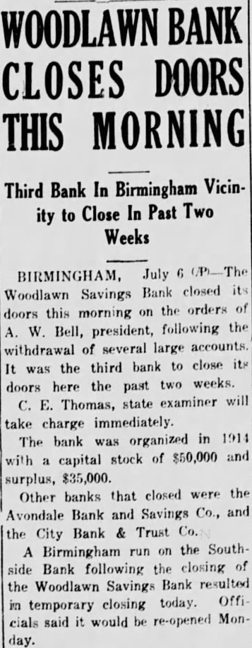 BIRMINGHAM, July Bank closed its Woodlawn Savings doors this morning on the orders of A. W. Bell, president, following the withdrawal of several large accounts. It was the third bank to close its doors here the past two weeks. C. E. Thomas, state examiner will take charge immediately. The bank was organized in 1914 with capital stock of $50,000 and surplus, $35,000. Other banks that closed were the Avondale Bank and Savings Co., and the City Bank & Trust Co. A Birmingham run on the Southside Bank following the closing of the Woodlawn Savings Bank resulted in temporary closing today. Officials said it would be re-opened Monday.