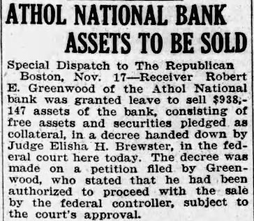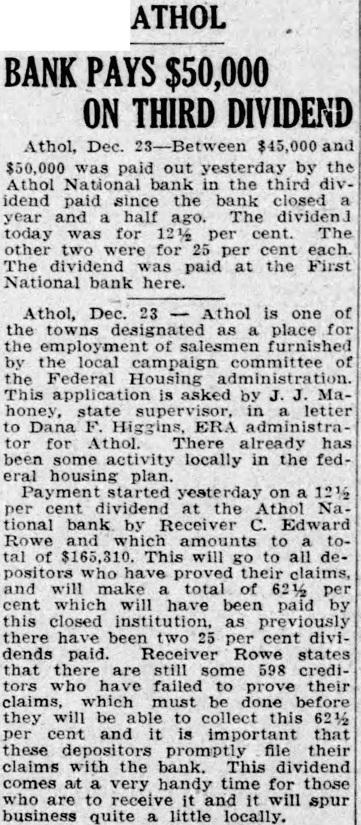 Athol, Dec. Rowe, receiver the Millers River bank, and Robert ceiver the Athol this that per cent would ately proved claims. Payment started both banks tonight. Checks cent dividend being delivered upon the surrender by positors of books in bank. The stated that this dend made the untiring effort and work the the trust, aid the treasury department, the insolvent and the Reconstruction ators David Walsh and Marcus Coolidge helpful, stated, in making this dividend possiTomorrow and Friday obtained either bank for funds Millers bank from and on Saturday from after that either Rowe's office on change street the Athol National This, the second 25 per cent dividend paid, $600,000 same the first dividend.