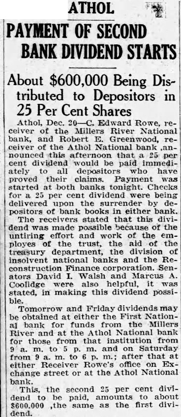 ATHOL PAYMENT OF SECOND BANK DIVIDEND STARTS About $600,000 Being Distributed to Depositors in 25 Per Cent Shares Athol, Dec. Rowe, receiver the Millers River bank, and Robert ceiver the Athol this that per cent would ately proved claims. Payment started both banks tonight. Checks cent dividend being delivered upon the surrender by positors of books in bank. The stated that this dend made the untiring effort and work the the trust, aid the treasury department, the insolvent and the Reconstruction ators David Walsh and Marcus Coolidge helpful, stated, in making this dividend possiTomorrow and Friday obtained either bank for funds Millers bank from and on Saturday from after that either Rowe's office on change street the Athol National This, the second 25 per cent dividend paid, $600,000 same the first dividend.