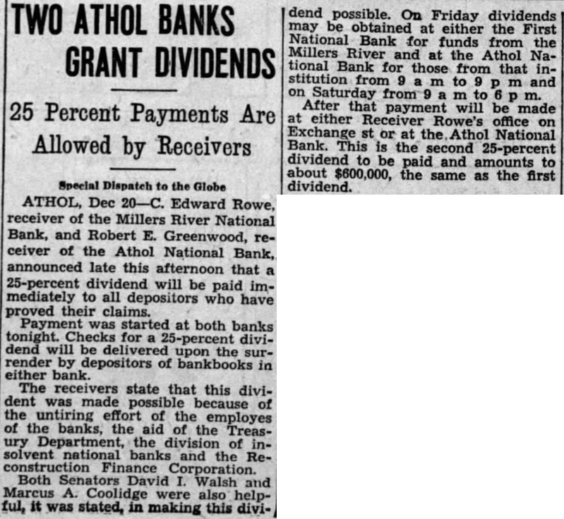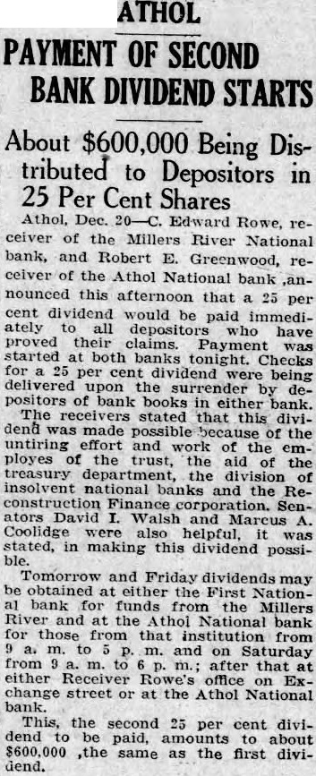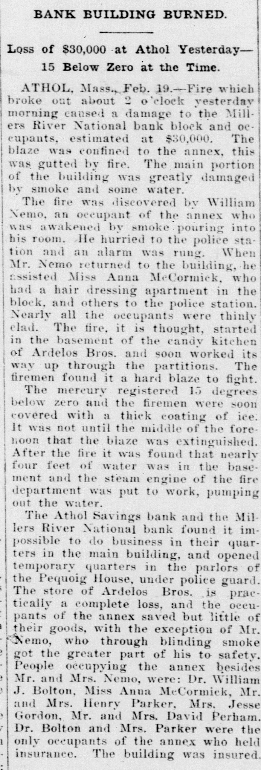 BANK BUILDING BURNED. Loss of $30,000 at Athol Yesterday15 Below Zero at the Time. ATHOL, Mass., Feb. 19.-Fire which broke out about 2 o'clock yesterday morning caused a damage to the Millers River National bank block and occupants, estimated at $30,000. The blaze was confined to the annex, this was gutted by fire. The main portion of the building was greatly damaged by smoke and some water. The fire was discovered by William Nemo, an occupant of the annex who was awakened by smoke pouring into his room. He hurried to the police station and an alarm was rung. When Mr. Nemo returned to the building, he assisted Miss Anna McCormick, who had a hair dressing apartment in the block, and others to the police station. Nearly all the occupants were thinly elad. The fire, it is thought, started in the basement of the candy kitchen of Ardelos Bros. and soon worked its way up through the partitions. The firemen found it a hard blaze to fight. The mercury registered 15 degrees below zero and the firemen were soon covered with a thick coating of ice. It was not until the middle of the forenoon that the blaze was extinguished. After the fire it was found that nearly four feet of water was in the basement and the steam engine of the fire department was put to work, pumping out the water. The Athol Savings bank and the Millers River National bank found it impossible to do business in their quarters in the main building, and opened temporary quarters in the parlors of the Pequoig House, under police guard. The store of Ardelos Bros. is practically a complete loss, and the occupants of the annex saved but little of their goods, with the exception of Mr. Nemo, who through blinding smoke got the greater part of his to safety. People occupying the annex besides Mr. and Mrs. Nemo, were: Dr. William e J. Bolton, Miss Anna McCormiek, Mr. and Mrs. Henry Parker, Mrs. Jesse Gordon, Mr. and Mrs. David Perham, Dr. Bolton and Mrs. Parker were the only occupants of the annex who held insurance. The building was insured.