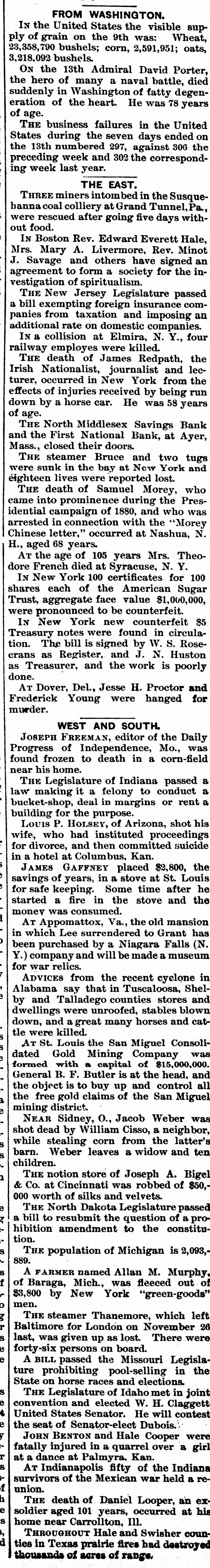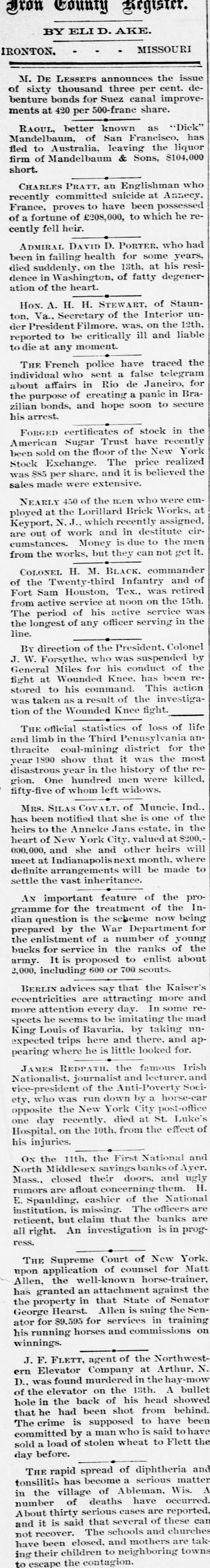 BANKS WRECKED BY A CASHIER. He Was a Church Member, But He Gambled in Stocks. AYER, Mass., Feb. 11.-The First National and North Middlesex banks closed their doors today, and ugly rumors are afloat concerning them. Spaulding; cashier of both institutions, has been missing since Monday evening and where he has gone no one knows. The exact financial condition of the bank is unknown. The books will be examined at once. Last week Spaulding ascertained that the directors of the North, Middlesex bank were about to have it examined, when he left home, not saying when he would return. Colonel Sedham, formerly bank examiner, has advised the banks not to pay out money until there has been an official investigation. He states that a letter has been found which indicates that Cashier Spaulding has been speculating in stocks. An investigation tends to show that both banks are solvent, the North Middlessex especially 80, as none of the funds have bee n tampered with. If there is any loss it shall fal on the National bank. Spaulding IS a regular member of the Methodist Episcopal church, and was supposed to be A man of sterling character and upright habits. CC amissiacher of Savings Banks Locke said that om a superficial examination he should think savings bank all right. The only chance for a discrepancy is on the pass-books of depositors. Bank Inspector Getchell has arrived to examine the condition of the national bank. The last balance sheet with the North Middlesex bank showed assets and liabilities of $198,000. The supreme court this evening issued an injunetion restraining the North Middlesex Savings bank from paying out any money until an investigation of the finances has been made. NEW YORK, Feb. 11.-Adolph A. Hoffman and Alfred E. Frommett, silk manufacturers of Patterson, N. J., assigned today without preference. LOUISVILLE, Feb. 11.-Mr. Levinge was today appointed receiver of the Kentucky Union Railway Company, on petition of Kennedy, Todd & Company and the Central Trust Company, of New York, who allege that they advanced money to the railroad company for which no return has been made. WILMINGTON, Del., Feb. 11.-The shortage of J. Eldridge Pierce, absconding secretary of the City Loan Association, will amount to $90,000. The assets of the concern are about $50,000, against $140,000 at this time last year. ST. PAUL, Feb. 11.-The National GermanAmerican bank has filed a petition for the appointment of a receiver for Charles Faber, proprietor of the St. Paul hotel, alleged to be insolvent. The petition alleges that Faber's debts amount to $120,000 and his assets to $90,000. PENDLETON, Or., Feb. 11.-M. J. Greene, secretary and manager of the Pendleton Hardware and Implement Company, which assigned yesterday, was arrested last evening on complaint of Benjamin Selling, president of the company, on a charge of abezziement. The examination occurs tomorrow. Greene is under $2,500 bonds. Greene maintains his innocence, and claims the charge has been brought against him by his enemies.