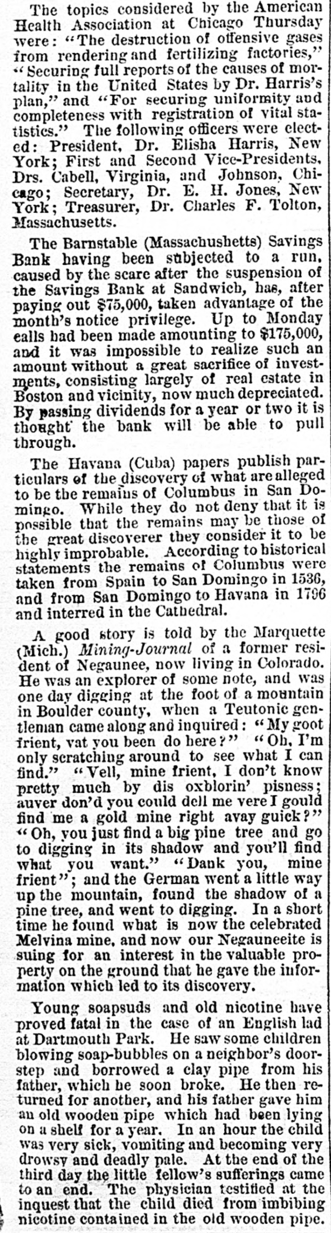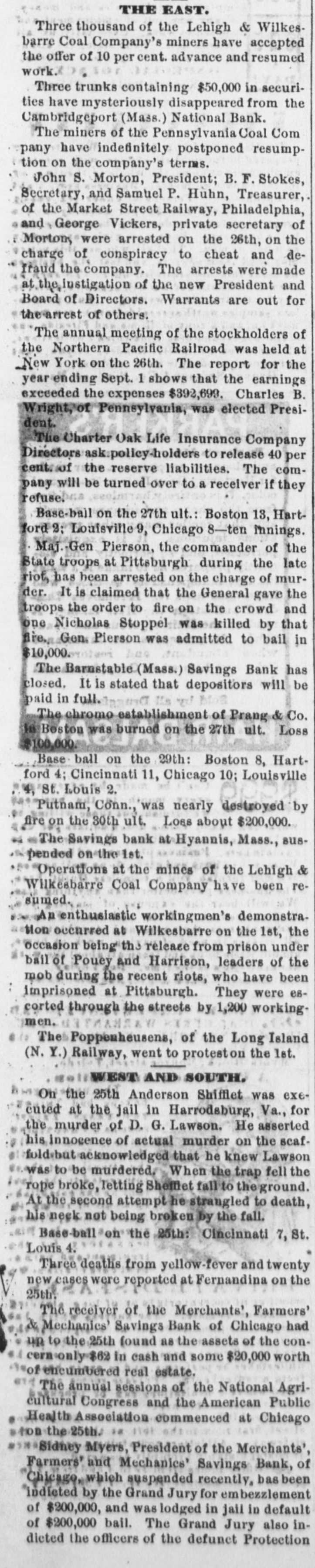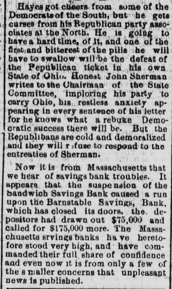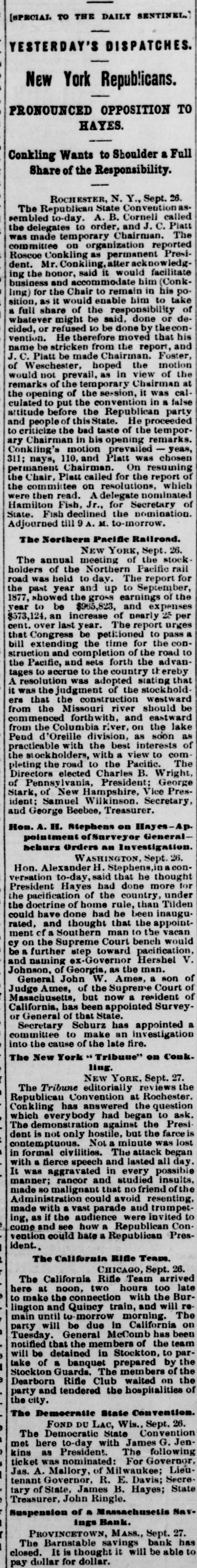 [SPECIAL TO THE DAILY SENTINEL.) YESTERDAY'S DISPATCHES. New York Republicans. PRONOUNCED OPPOSITION TO HAYES. Conkling Wants to Shoulder a Full Share of the Responsibility. ROCHESTER, N. Y., Sept. 26. The Republican State Conventionas sembled to-day. A. B. Cornell called the delegates to order, and J. C. Platt was made temporary Chairman. The committee on organization reported Roscoe Conkling as permanent President. Mr. Conkling, after acknowledging the honor, said it would facilitate business and accommodate him (Conkling) for the Chair to remain in his po. sition, as it would enable him to take a full share of the responsibility of whatever might be said, done or decided, or refused to be done by the convention. He therefore moved that his name be stricken from the report, and J. C. Platt be made Chairman. Foster, of Weschester, hoped the motion would not prevail, as in view of the remarks of the temporary Chairman at the opening of the session, it was calculated to put the convention in a false attitude before the Republican party and people of this State. He proceeded to criticize the bad taste of the temporary Chairman in his opening remarks. Conkling's motion prevailed - yeas, 311; nays, 110, and Platt was chosen permanent Chairman. On resuming the Chair, Platt called for the report of the committee on resolutions, which were then read. A delegate nominated Hamilton Fish, Jr., for Secretary of State. Fish declined the nomination. Adjourned till 9 A. M. to-morrow. The Northern Pacific Railroad. NEW YORK, Sept. 26. The annual meeting of the stock. holders of the Northern Pacific rail road was held to day. The report for the past year and up to September, 1877, showed the gross earnings of the year to be $965,823, and expenses $573,124, an increase of nearly 25 per cent. over last year. The report urges that Congress be petitioned to pass a bill extending the time for the construction and completion of the road to the Pacific, and sets forth the advantages to accrue to the country th ereby A resolution was adopted stating that it was the judgment of the stockhold. ers that the construction westward from the Missouri river should be commenced forthwith, and eastward from the Columbia river, on the lake Pend d'Oreille division, as soon as practicable with the best interests of the stockholders, with a view to completing the road to the Pacific. The Directors elected Charles B. Wright, of Pennsylvania, President; George Stark, of New Hampshire, Vice President; Samuel Wilkinson. Secretary, and George Beebee, Treasurer. Hon. A. H. Stephens on Hayes-Ap. pointment ofSurveyor Generalbehurz Orders an Investigation. WASHINGTON, Sept. 26. Hon. Alexander H. Stephens,in conversation to-day, said that he thought President Hayes had done more for the pacification of the country, under the doctrine of home rule, than Tilden could have done had he been inaugurated, and thought that the appointment of a Southern man to the vacan cy on the Supreme Court bench would be a further step toward pacitication, and naming ex-Governor Hershel V. Johnson, of Georgia, as the man. General John W. Ames, a son of Judge Ames, of the Supreme Court of Masachusetts, but now a resident of California, has been appointed Surveyor General of that State. Secretary Schurz has appointed a committee to make an investigation into the cause of the late fire. The New York " Tribuue" on Conk. ling. NEW YORK. Sept. 27. The Tribune editorially reviews the Republican Convention at Rochester. Conkling has answered the question which everybody had began to ask. The demonstration against the President is not only hostile, but the farce is contemptuous. Not a minute was lost in formal civilities. The attack began with a fierce speech and lasted all day. It was aggravated in every possible manner; rancor and studied insults, made 80 malignant that no friend of the Administration could avoid resenting, made with a vast parade and trumpeting, as if the audience were invited to come and see how a Republican Convention could hate a Republican President., The California Rifle Team. CHICAGO, Sept. 26. The California Rifle Team arrived here at noon, two hours too late to make the connection with the Burlington and Quincy train, and will remain until to morrow morning. The party will be due in California on Tuesday. General McComb has been notified that the members of the team will be detained in Stockton, to partake of a banquet prepared by the Stockton Guards. The members of the Dearborn Rifle Club waited on the party and tendered the hospitalities of the city. The Democratic State Convention. FOND DU Lac, Wis., Sept. 26. The Democratic State Convention met here to-day with James G. Jenkins as President. The following ticket was nominated: For Governor, Jas. A. Mallory, of Milwaukee; Lieutenant Governor, R. E. Davis; Secretary of State, James B. Hayes; State Treasurer, John Ringle. Suspension of a Massachusetis Savings Bank. PROVINCETOWN, Mass., Sept. 27. The Barnstable savings bank has closed. It is thought it will be able to pay dollar for dollar.