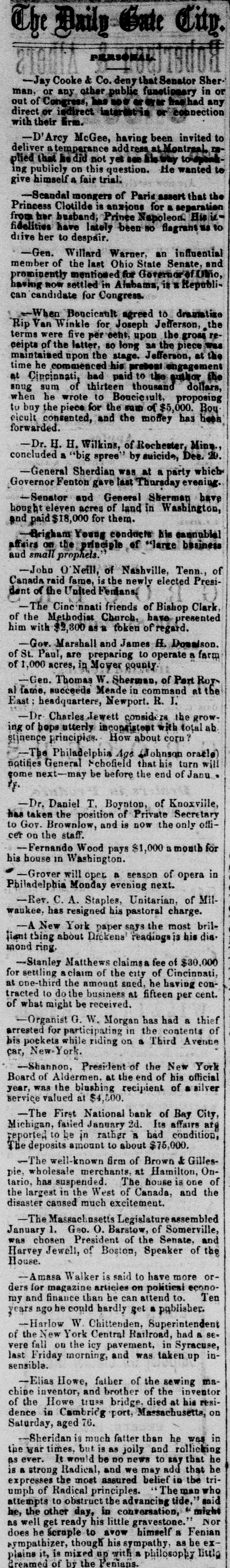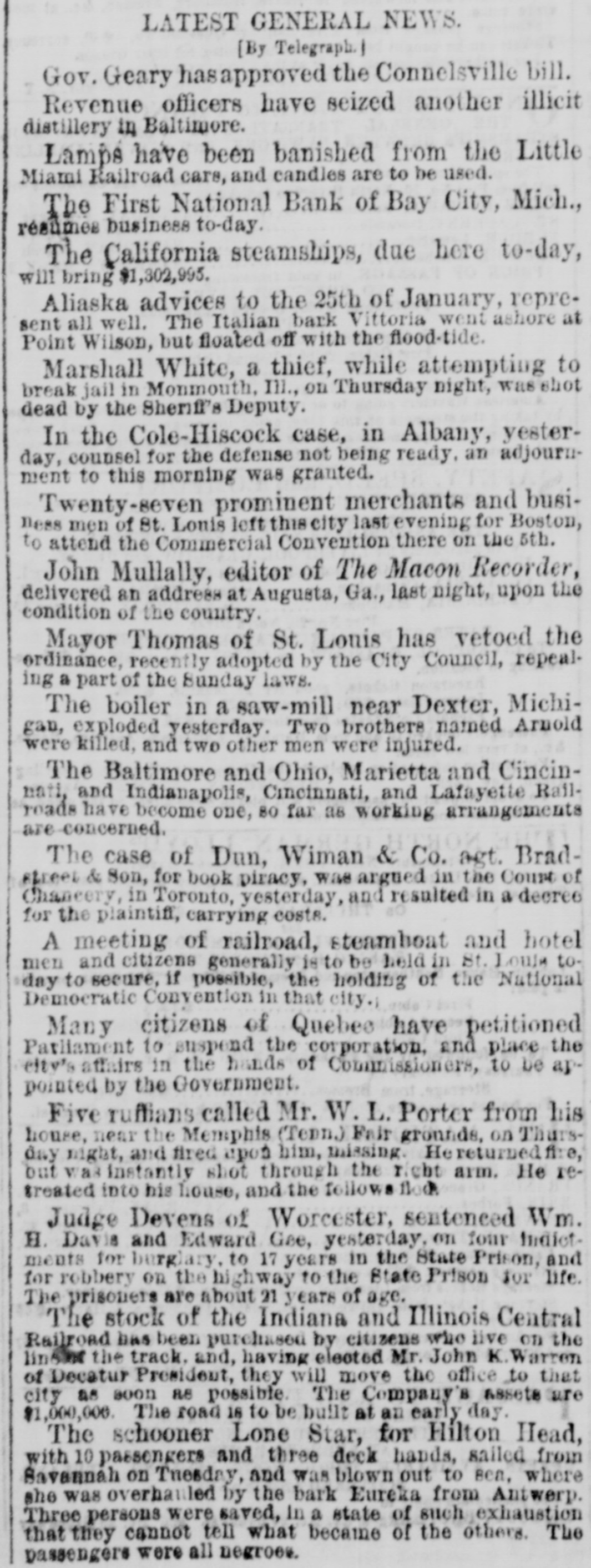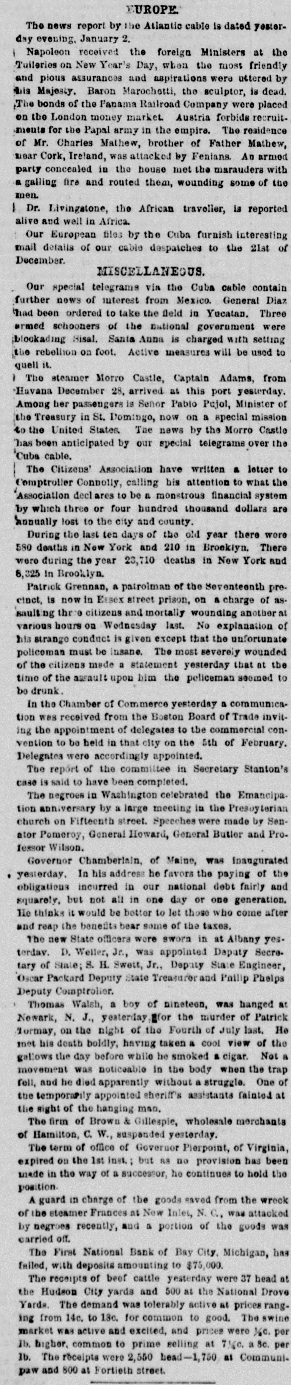 EUROPE. The news report by the Atlantic cable is dated yesterday evening, January 2. 1 Napoleon received the foreign Ministers at the Tuileries on New Year's Day, when the most friendly and pious assurances and aspirations were uttered by this Majesty. Baron Marochetti, the sculptor, is dead. The bonds of the Panama Railroad Company were placed on the London money market. Austria forbids recruitments for the Papal army in the empire. The residence of Mr. Charles Mathew, brother of Father Mathew, mear Cork, Ireland, was attacked by Fenians. An armed party concealed in the house met the marauders with a galling fire and routed them, wounding some of the men. I Dr. Livingatone, the African traveller, is reported alive and well in Africa. Our European files by the Cuba furnish interesting mail details of our cable despatches to the 21st of December. MISCELLANEOUS. Our special telegrams via the Cuba cable contain further news of interest from Mexico. General Diaz Thad been ordered to take the field in Yucatan. Three armed schooners of the national government were blockading Sisal. Santa Anna is charged with setting the rebellion on foot. Active measures will be used to quell it. ) The steamer Morro Castle, Captain Adams, from Havana December 28, arrived at this port yesterday. Among her passengers is Senor Pablo Pujol, Minister of the Treasury in St. Domingo, now on a special mission to the United States. The news by the Morro Castle has been anticipated by our special telegrams over the Cuba cable. The Citizens' Association have written a letter to Comptroller Connolly, calling his attention to what the Association decl ares to be a monstrous financial system by which three or four hundred thousand dollars are Innually lost to the city and county. During the last ten days of the old year there were 580 deaths in New York and 210 in Brooklyn. There were during the year 23,710 deaths in New York and 8,325 In Brooklyn. Patrick Grennan, a patrolman of the Seventeenth precinct, is now in Essex street prison, on a charge of assaulting three citizens and mortally wounding another at various hours on Wednesday last. No explanation of his strange conduct is given except that the unfortunate policeman must be insane. The most severely wounded of the citizens made a statement yesterday that at the time of the assault upon him the peliceman seemed to be drunk. In the Chamber of Commerce yesterday a communication was received from the Boston Board of Trade inviting the appointment of delegates to the commercial convention to be held in that city on the 5th of February. Delegates were accordingly appointed. The report of the committee in Secretary Stanton's case is said to have been completed. The negroes in Washington celebrated the Emancipation anniversary by a large meeting in the Presoyterian church on Fifteenth street. Speeches were made by Senator Pomeroy, General Howard, General Butler and Professor Wilson. Governor Chamberlain, of Maine, was inaugurated yesterday. In his address he favors the paying of the obligations incurred in our national debt fairly and squarely, but not all in one day or one generation. He thinks it would be better to let those who come after and reap the benefits bear some of the taxes. The new State officers were sworn in at Albany yesterday. D. Weller, Jr., was appointed Deputy Secretary of State; S. H. Swett, Jr., Deputy State Engineer, Oscar Packard Deputy State Treasurerand Pailip Phelps Deputy Comptrolier. Thomas Walsh, a boy of nineteen, was hanged at Newark, N. J., yesterday the murder of Patrick Tormay, on the night of the Fourth of July last. He met his death boldly, having taken a cool view of the gallows the day before while he smoked a cigar. Not a movement was noticeable in the body when the trap fell, and he died apparently without a struggle. One of the temporarily appointed sheriff's assistants fainted at the sight of the hanging man. The firm of Brown & Gillespie, wholesale merchants of Hamilton, C. W., suspanded yesterday. The term of office of Governor Pierpoint, of Virginia, expired on the 1st inst; but AS no provision has been made in the way of a successor, he continues to hold the position. A guard in charge of the goods saved from the wreck of the steamer Frances at New Inlet, N. C., was attacked by negroes recently, and a portion of the goods was carried off. The First National Bank of Bay City, Michigan, has failed, with deposits amounting to $75,000. The receipts of beef cattle yesterday were 37 head at the Hudson City yards and 500 at the National Drove Yards. The demand was tolerably active at prices ranging from 14c. to 18c. for common to good. The swine market was active and excited, and prices were 1/20. per 1b. higher. common to prime selling at 71/20. a 8c. per 1b. The receipts were 2,550 head-1,750 at Communipaw and 800 at Fortieth street.