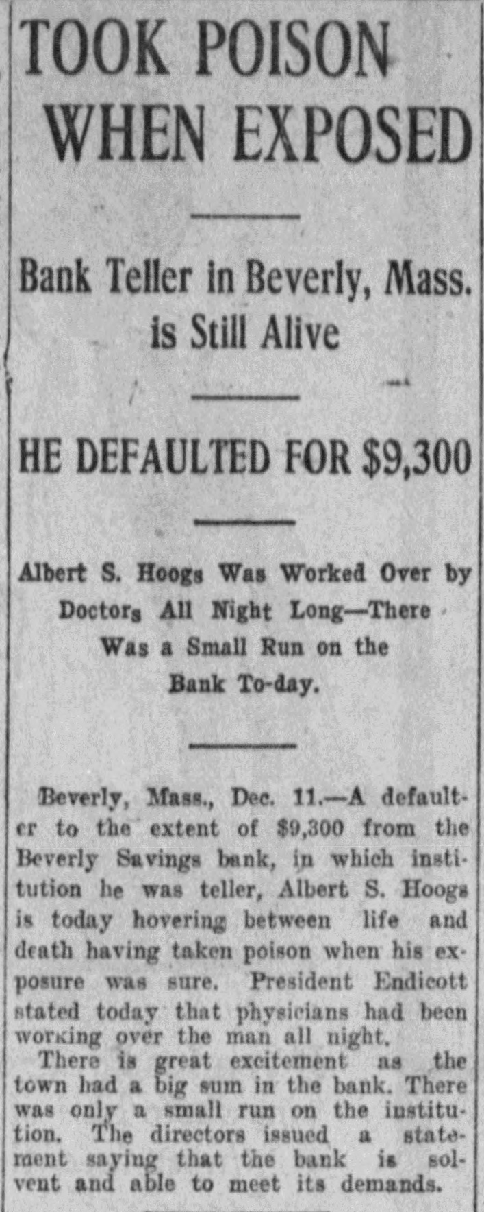 TOOK POISON WHEN EXPOSED Bank Teller in Beverly, Mass. is Still Alive HE DEFAULTED FOR $9,300 Albert S. Hoogs Was Worked Over by Doctors All Night Long-There Was a Small Run on the Bank To-day. Beverly, Mass., Dec. 11.-A defaulter to the extent of $9,300 from the Beverly Savings bank, in which institution he was teller, Albert S. Hoogs is today hovering between life and death having taken poison when his exposure was sure. President Endicott stated today that physicians had been working over the man all night. There is great excitement as the town had a big sum in the bank. There was only a small run on the institution. The directors issued a statement saying that the bank is solvent and able to meet its demands.