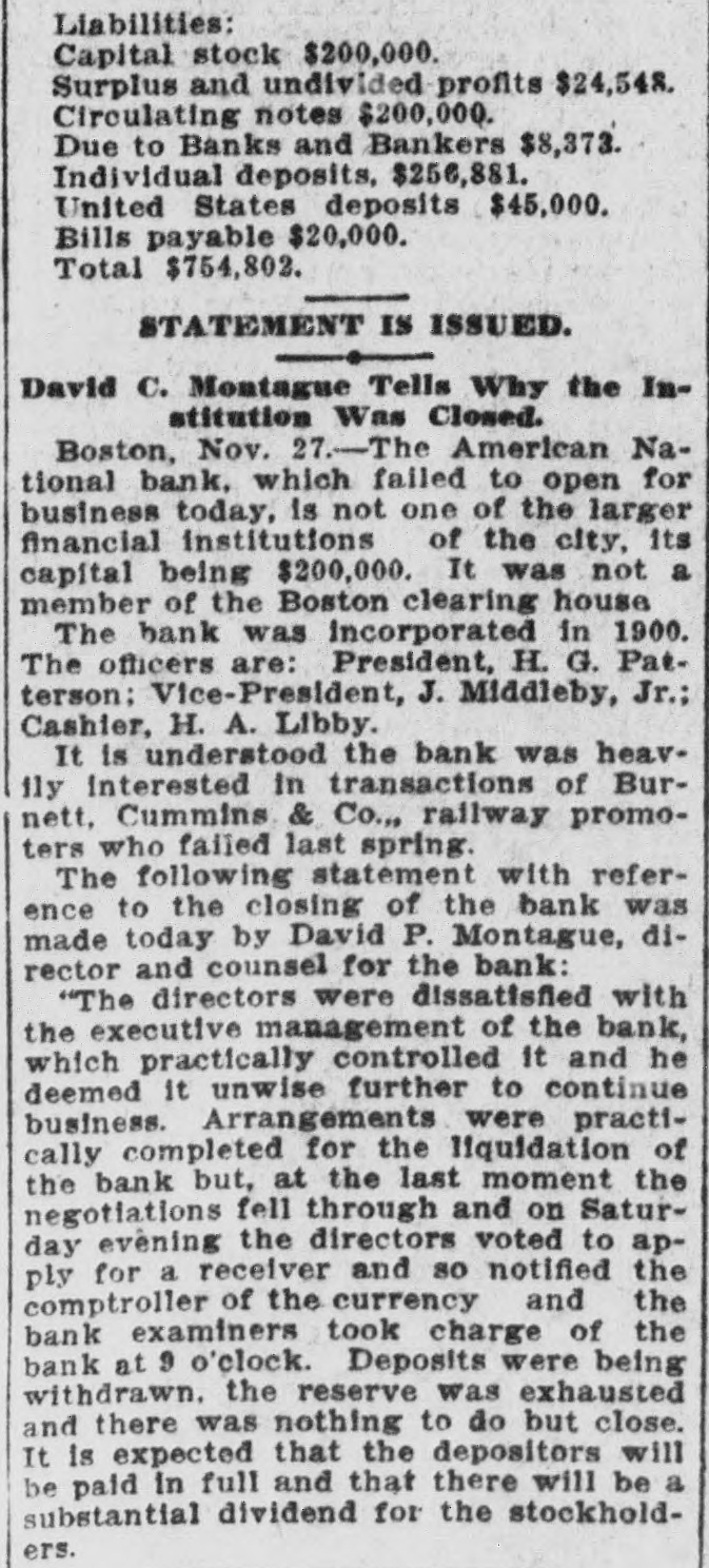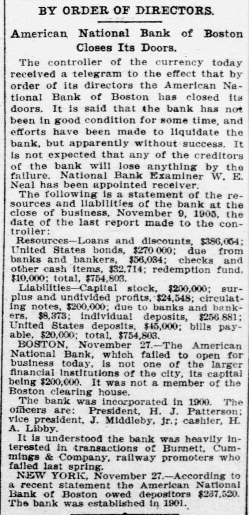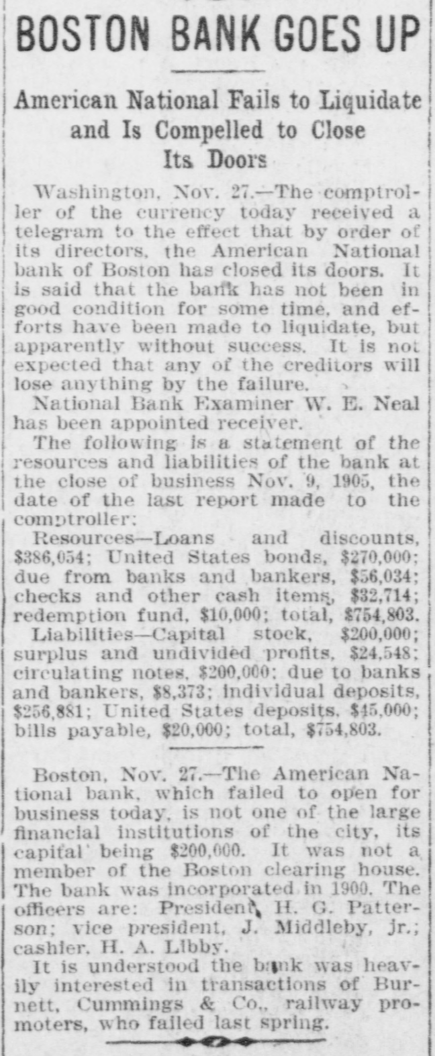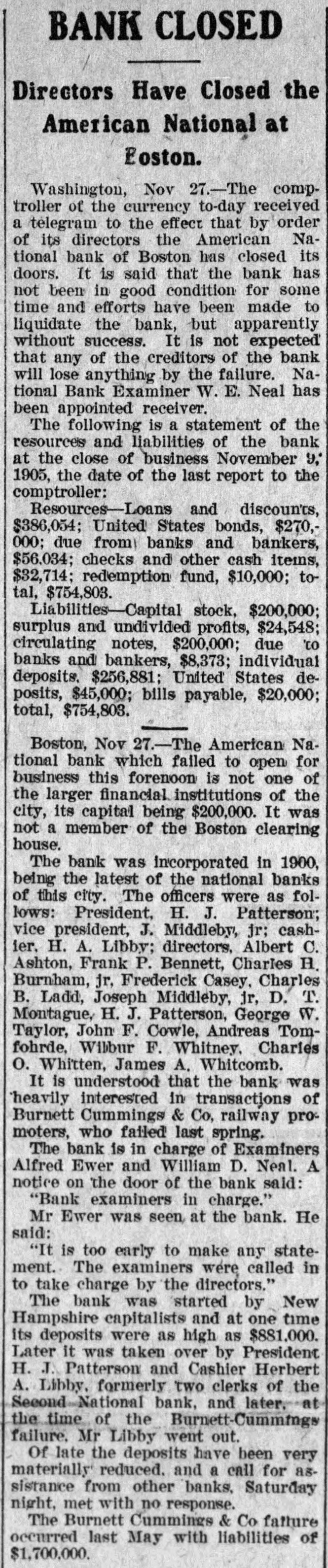 BANK CLOSED Directors Have Closed the American National at Boston. Washington, Nov 27.-The comptroller of the currency to-day received a telegram to the effect that by order of its directors the American National bank of Boston has closed its doors. It is said that the bank has not been in good condition for some time and efforts have been made to liquidate the bank, but apparently without success. It is not expected that any of the creditors of the bank will lose anything by the failure. National Bank Examiner W. E. Neal has been appointed receiver. The following is a statement of the resources and liabilities of the bank at the close of business November 9, 1905, the date of the last report to the comptroller: Resources-Loans and discounts, $386,054; United States bonds, $270,000; due from banks and bankers, $56.034; checks and other cash items, $32,714; redemption fund, $10,000; total, $754,803. Liabilities-Capital stock, $200,000; surplus and undivided profits, $24,548; circulating notes, $200,000; due 'to banks and bankers, $8,373; individual deposits, $256,881; United States deposits, $45,000; bills payable, $20,000; total, $754,803. Boston, Nov 27.-The American National bank which failed to open for business this forenoon is not one of the larger financial institutions of the city, its capital being $200,000. It was not a member of the Boston clearing house. The bank was incorporated in 1900, being the latest of the national banks of this city. The officers were as follows: President, H. J. Patterson; vice president, J. Middleby, jr; cashier. H. A. Libby; directors, Albert C. Ashton, Frank P. Bennett, Charles H. Burnham, jr, Frederick Casey, Charles B. Ladd, Joseph Middleby, jr, D. T. Montague, H. J. Patterson, George W. Taylor, John F. Cowle, Andreas Tomfohrde, Wilbur F. Whitney, Charles O. Whitten, James A. Whitcomb. It is understood that the bank was "heavily interested in transactions of Burnett Cummings & Co, railway promoters, who failed last spring. The bank is in charge of Examiners Alfred Ewer and William D. Neal. A notice on the door of the bank said: "Bank examiners in charge." Mr Ewer was seen at the bank. He said: "It is too early to make any statement. The examiners were called in to take charge by the directors." The bank was started by New Hampshire capitalists and at one time its deposits were as high as $881.000. Later it was taken over by President H. J. Patterson and Cashier Herbert A. Libby, formerly two clerks of the Second National bank, and later. at the time of the Burnett-Cummings failure. Mr Libby went out. Of late the deposits have been very materially reduced. and a call for assistance from other banks, Saturday night, met with no response. The Burnett Cummings & Co fatture occurred last May with liabilities of $1,700,000.