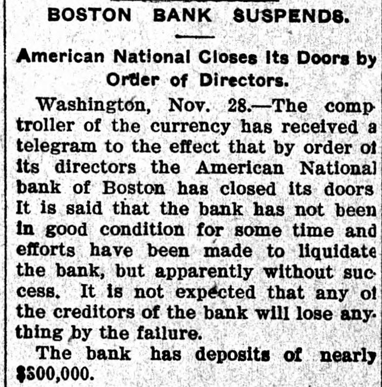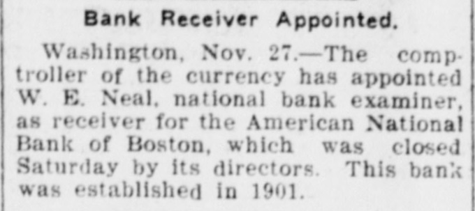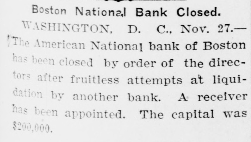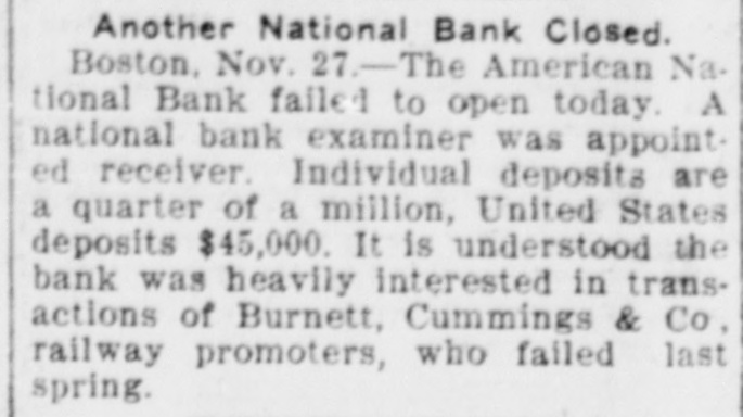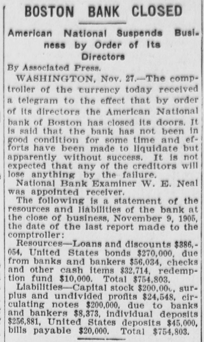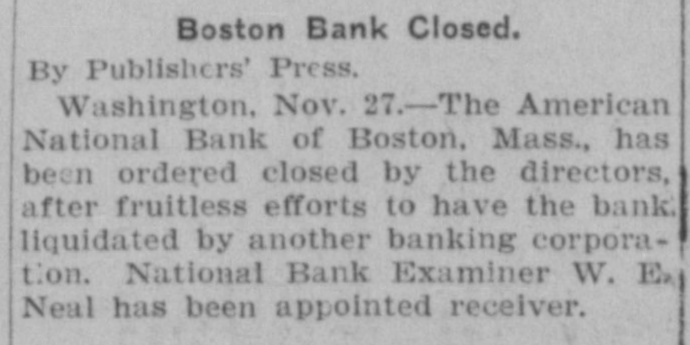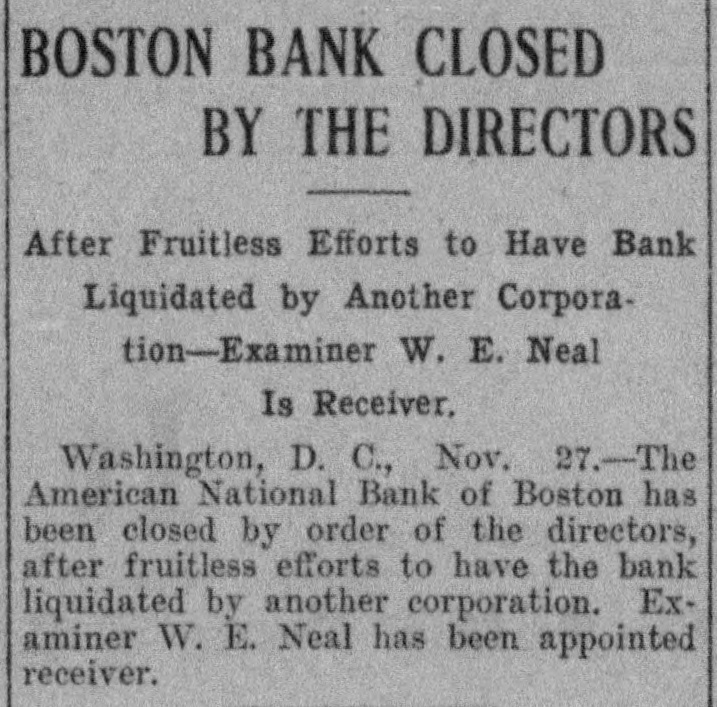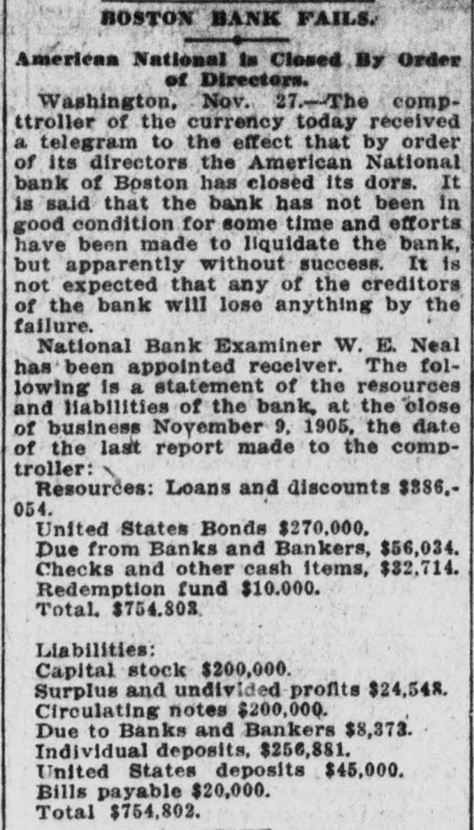 BANK CLOSED Directors Have Closed the American National at Boston. Washington, Nov 27.-The comptroller of the currency to-day received a telegram to the effect that by order of its directors the American National bank of Boston has closed its doors. It is said that the bank has not been in good condition for some time and efforts have been made to liquidate the bank, but apparently without success. It is not expected that any of the creditors of the bank will lose anything by the failure. National Bank Examiner W. E. Neal has been appointed receiver. The following is a statement of the resources and liabilities of the bank at the close of business November 9, 1905, the date of the last report to the comptroller: Resources-Loans and discounts, $386,054; United States bonds, $270,000; due from banks and bankers, $56.034; checks and other cash items, $32,714; redemption fund, $10,000; total, $754,803. Liabilities-Capital stock, $200,000; surplus and undivided profits, $24,548; circulating notes, $200,000; due 'to banks and bankers, $8,373; individual deposits, $256,881; United States deposits, $45,000; bills payable, $20,000; total, $754,803. Boston, Nov 27.-The American National bank which failed to open for business this forenoon is not one of the larger financial institutions of the city, its capital being $200,000. It was not a member of the Boston clearing house. The bank was incorporated in 1900, being the latest of the national banks of this city. The officers were as follows: President, H. J. Patterson; vice president, J. Middleby, jr; cashier. H. A. Libby; directors, Albert C. Ashton, Frank P. Bennett, Charles H. Burnham, jr, Frederick Casey, Charles B. Ladd, Joseph Middleby, jr, D. T. Montague, H. J. Patterson, George W. Taylor, John F. Cowle, Andreas Tomfohrde, Wilbur F. Whitney, Charles O. Whitten, James A. Whitcomb. It is understood that the bank was "heavily interested in transactions of Burnett Cummings & Co, railway promoters, who failed last spring. The bank is in charge of Examiners Alfred Ewer and William D. Neal. A notice on the door of the bank said: "Bank examiners in charge." Mr Ewer was seen at the bank. He said: "It is too early to make any statement. The examiners were called in to take charge by the directors." The bank was started by New Hampshire capitalists and at one time its deposits were as high as $881.000. Later it was taken over by President H. J. Patterson and Cashier Herbert A. Libby, formerly two clerks of the Second National bank, and later. at the time of the Burnett-Cummings failure. Mr Libby went out. Of late the deposits have been very materially reduced. and a call for assistance from other banks, Saturday night, met with no response. The Burnett Cummings & Co fatture occurred last May with liabilities of $1,700,000.