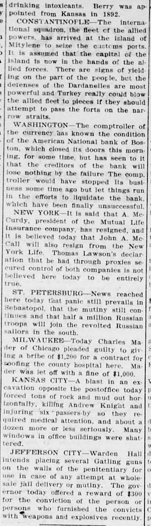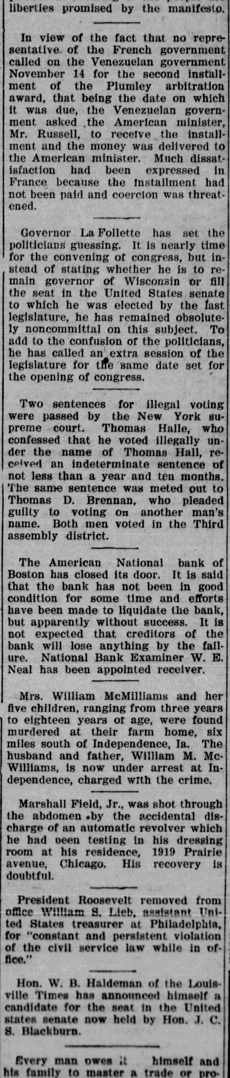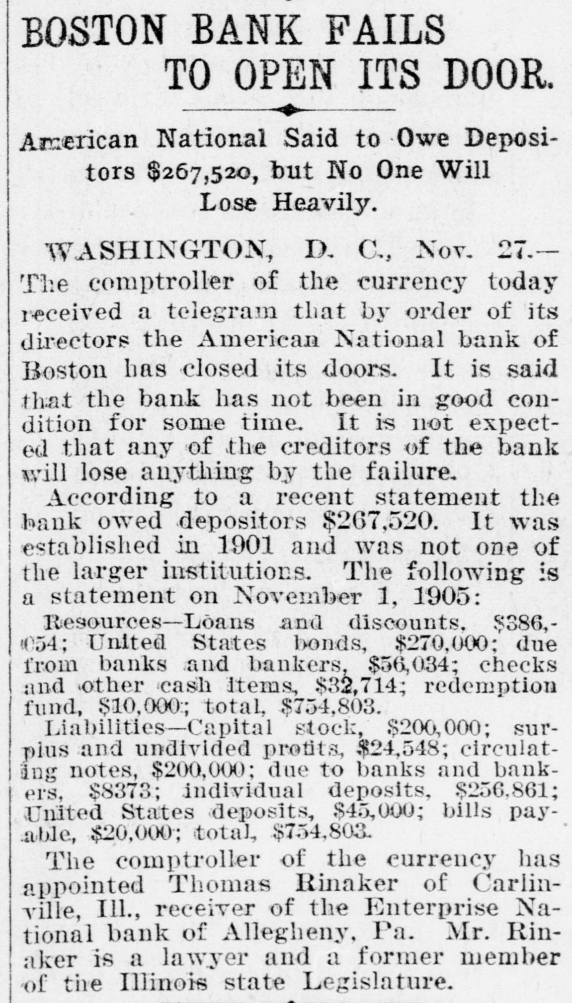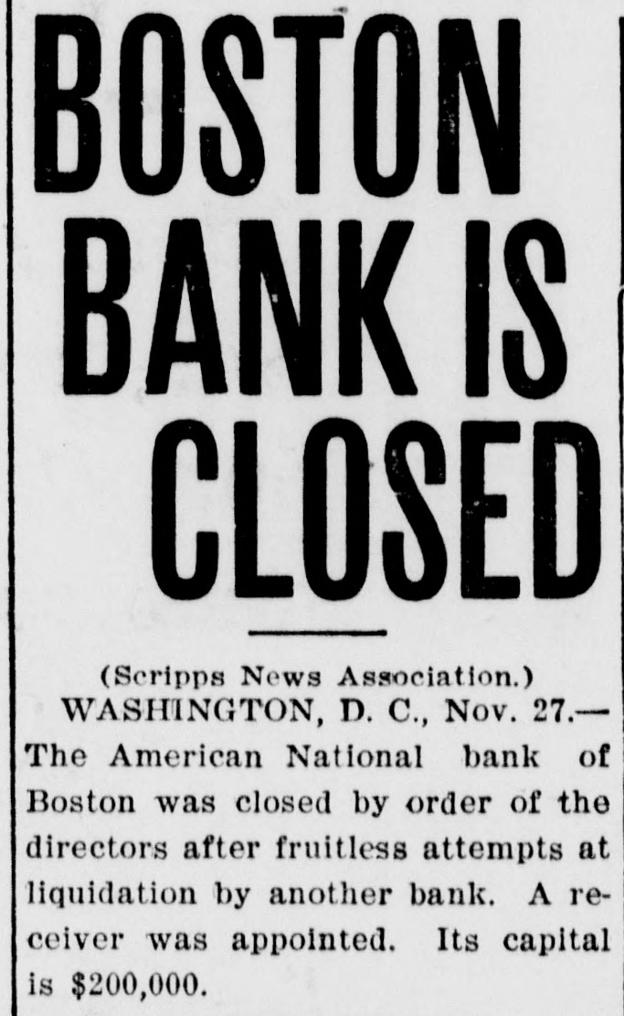BANK CLOSED Directors Have Closed the American National at Boston. Washington, Nov 27.-The comptroller of the currency to-day received a telegram to the effect that by order of its directors the American National bank of Boston has closed its doors. It is said that the bank has not been in good condition for some time and efforts have been made to liquidate the bank, but apparently without success. It is not expected that any of the creditors of the bank will lose anything by the failure. National Bank Examiner W. E. Neal has been appointed receiver. The following is a statement of the resources and liabilities of the bank at the close of business November 9, 1905, the date of the last report to the comptroller: Resources-Loans and discounts, $386,054; United States bonds, $270,000; due from banks and bankers, $56.034; checks and other cash items, $32,714; redemption fund, $10,000; total, $754,803. Liabilities-Capital stock, $200,000; surplus and undivided profits, $24,548; circulating notes, $200,000; due 'to banks and bankers, $8,373; individual deposits, $256,881; United States deposits, $45,000; bills payable, $20,000; total, $754,803. Boston, Nov 27.-The American National bank which failed to open for business this forenoon is not one of the larger financial institutions of the city, its capital being $200,000. It was not a member of the Boston clearing house. The bank was incorporated in 1900, being the latest of the national banks of this city. The officers were as follows: President, H. J. Patterson; vice president, J. Middleby, jr; cashier. H. A. Libby; directors, Albert C. Ashton, Frank P. Bennett, Charles H. Burnham, jr, Frederick Casey, Charles B. Ladd, Joseph Middleby, jr, D. T. Montague, H. J. Patterson, George W. Taylor, John F. Cowle, Andreas Tomfohrde, Wilbur F. Whitney, Charles O. Whitten, James A. Whitcomb. It is understood that the bank was "heavily interested in transactions of Burnett Cummings & Co, railway promoters, who failed last spring. The bank is in charge of Examiners Alfred Ewer and William D. Neal. A notice on the door of the bank said: "Bank examiners in charge." Mr Ewer was seen at the bank. He said: "It is too early to make any statement. The examiners were called in to take charge by the directors." The bank was started by New Hampshire capitalists and at one time its deposits were as high as $881.000. Later it was taken over by President H. J. Patterson and Cashier Herbert A. Libby, formerly two clerks of the Second National bank, and later. at the time of the Burnett-Cummings failure. Mr Libby went out. Of late the deposits have been very materially reduced. and a call for assistance from other banks, Saturday night, met with no response. The Burnett Cummings & Co fatture occurred last May with liabilities of $1,700,000.