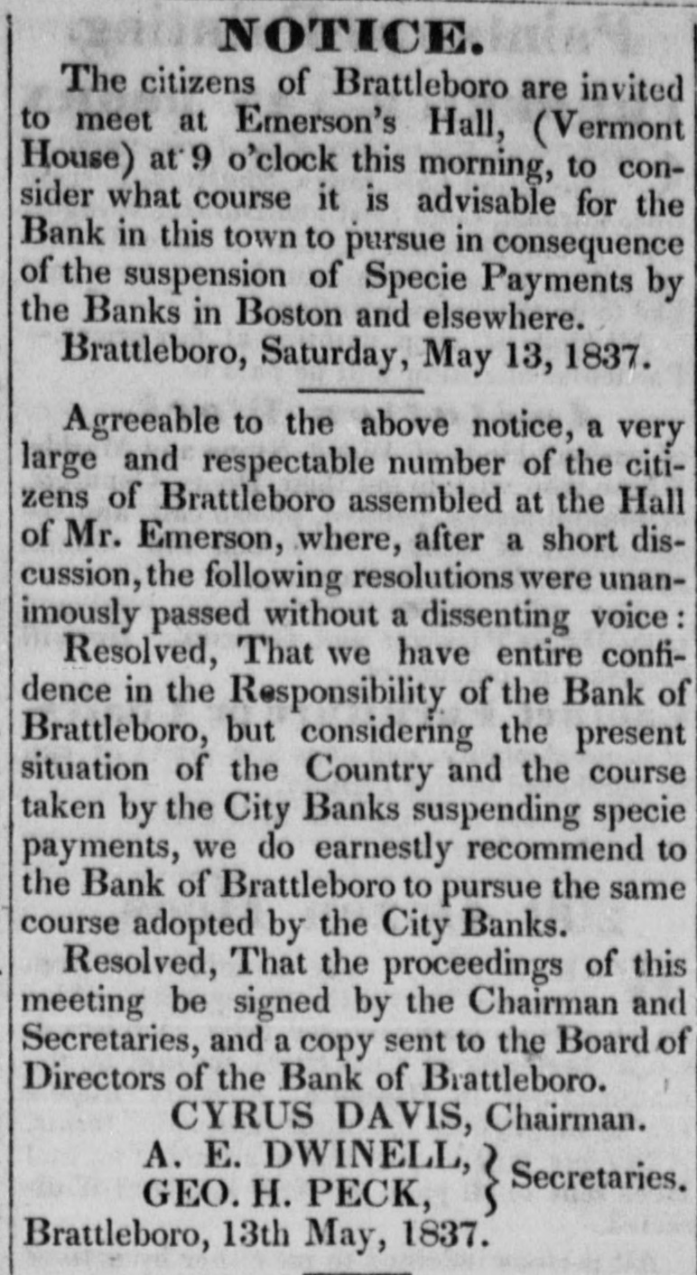 NOTICE. The citizens of Brattleboro are invited to meet at Emerson's Hall, (Vermont House) at 9 o'clock this morning, to consider what course it is advisable for the Bank in this town to pursue in consequence of the suspension of Specie Payments by the Banks in Boston and elsewhere. Brattleboro, Saturday, May 13, 1837. Agreeable to the above notice, a very large and respectable number of the citizens of Brattleboro assembled at the Hall of Mr. Emerson, where, after a short discussion, the following resolutions were unanimously passed without a dissenting voice: Resolved, That we have entire confidence in the Responsibility of the Bank of Brattleboro, but considering the present situation of the Country and the course taken by the City Banks suspending specie payments, we do earnestly recommend to the Bank of Brattleboro to pursue the same course adopted by the City Banks. Resolved, That the proceedings of this meeting be signed by the Chairman and Secretaries, and a copy sent to the Board of Directors of the Bank of Brattleboro. CYRUS DAVIS, Chairman. A. E. DWINELL, Secretaries. GEO. H. PECK, Brattleboro, 13th May, 1837.