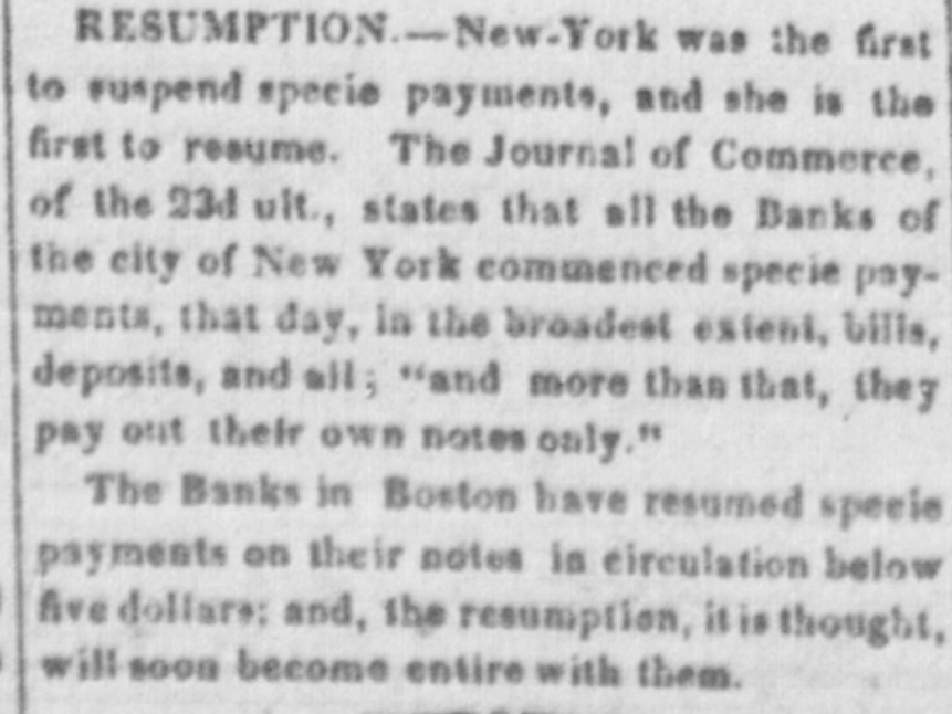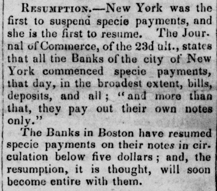 RESUMPTION-New-York was the first to suspend specie payments, and she is the first to resume. The Journal of Commerce, of the 23d ult., states that all the Banks of the city of New York commenced specie payments, that day, in the broadest estent, bills, deposits, and all; "and more than that, they pay out their own notes only." The Banks in Boston have resumed speele payments on their notes is circulation below five dollars: and, the resumption, it is thought, will-soon become entire with them.