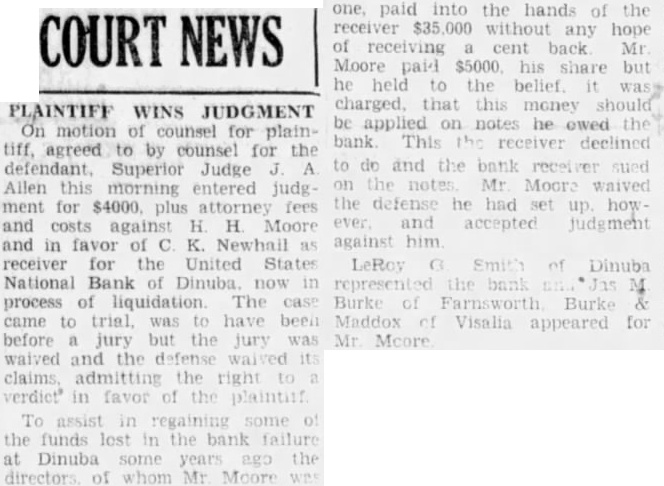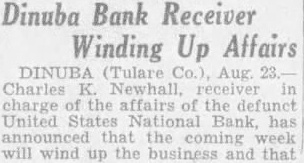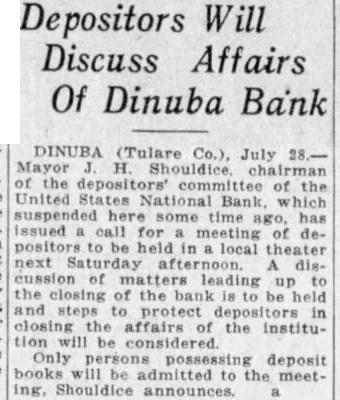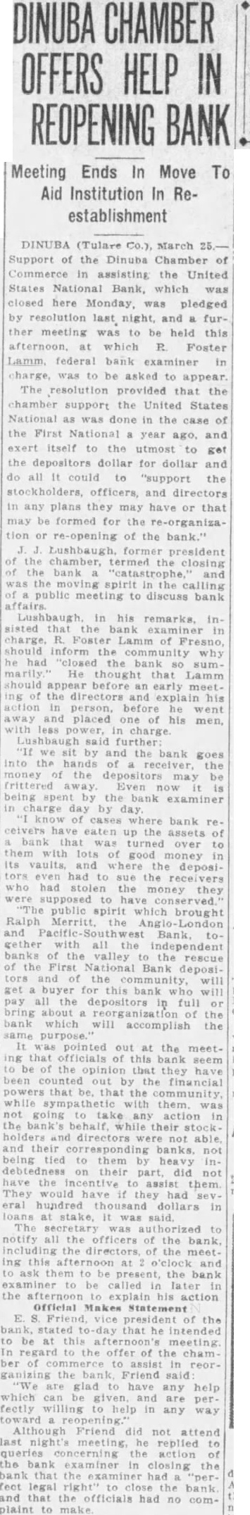 DINUBA CHAMBER OFFERS HELP IN REOPENING BANK Meeting Ends In Move To Aid Institution In Reestablishment DINUBA (Tulare March Support of the Dinuba Chamber of Commerce in assisting the United States National Bank, which was closed here Monday, was pledged by resolution last night, and a further meeting was to be held this afternoon. at which R. Foster Lamm, federal examiner in charge, was to asked to appear. The resolution provided that the chamber support the United States National as done in the case of the First National year ago, and exert itself to the utmost to get the depositors dollar for dollar and do all It could to "support the stockholders, officers, and directors in any plans or that may be formed for the re-organization or re-opening of the bank." Lushbaugh, former president the chamber, termed the closing the bank "catastrophe, in the public meeting to discuss bank sisted that bank in charge. Foster Lamm of Fresno, should inform the community why he the bank sum He thought that Lamm should early the directors and his action person, before he away placed his men, less charge Lushbaugh said further "If by and the bank goes hands of the money may be is being the examiner in charge day by know of where bank receivers eaten up the assets of bank turned over to good money in its the deposithe had stolen the money they supposed public spirit which brought Ralph Merritt London Pacific Bank together all independent banks of the valley the rescue First National Bank depositors get pay all the depositors full or bring about of the bank which will accomplish the purpose. It pointed out at the meeting that officials of this bank seem that have the financial powers that that the community, while them. going action in the bank's behalf. while their stock holders and directors were not able, and corresponding banks. not being to them debtedness their part, did They would had eral hundred dollars in at stake, was said. secretary authorized to notify the officers of the bank, the of the meet ing be the bank examiner to be called the his action Official Makes Statement E. president of the bank, stated that he intended to be at this afternoon' In regard the the cham ber the Friend said are glad have any help which can given and are perfectly willing help any way Although Friend did not attend night's replied the the bank examiner closing the bank the examiner had feet legal right" the bank and that the officials had no complaint to make