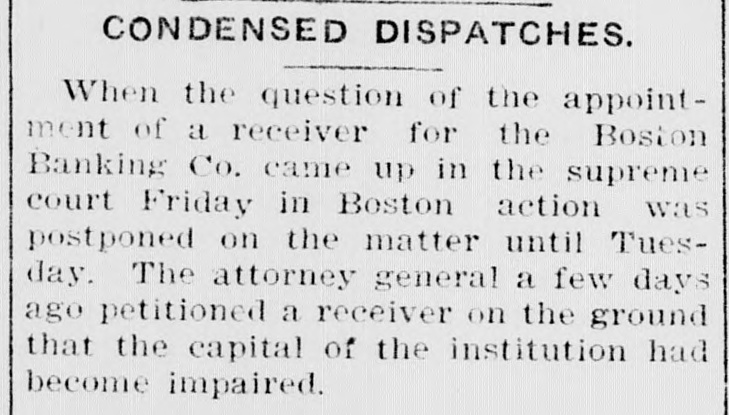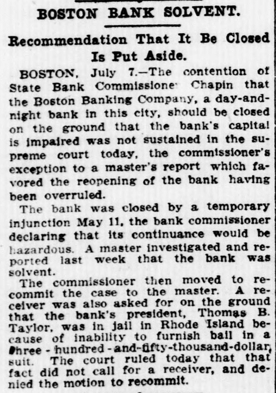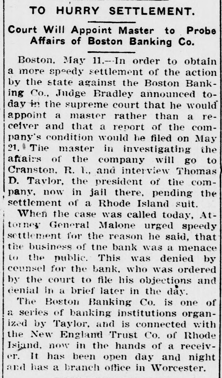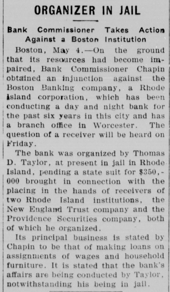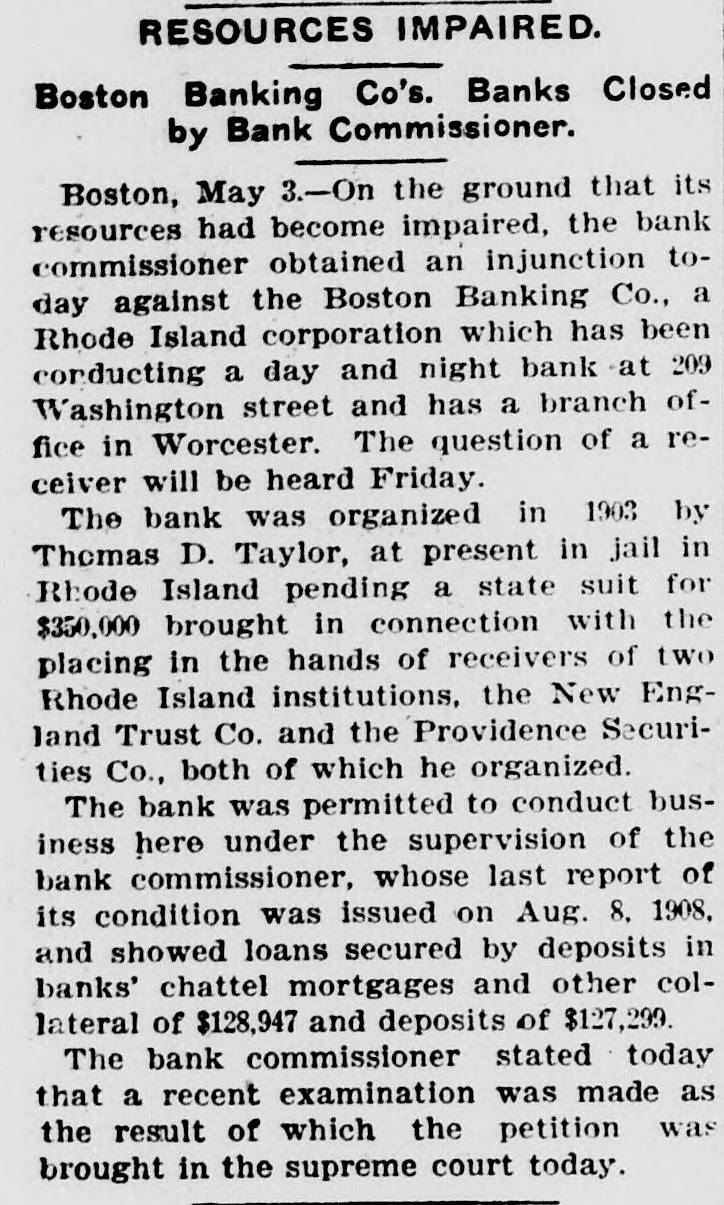 ITS RESOURCES IMPAIRED. Injunction Against Boston Banking Company of Boston. Boston, May 3.-On the ground that its resources had become impaired, States Savings Bank Commissioner Arthur B. Chapin obtained an, injunction today in the superior court against the Boston Banking company, a Rhode Island corporation, which has been conducting as a day a night bank for the past six years at 209 Washington street, and which has a branch office in Rochester. A hearing on the question of appointing a receiver will be held Friday. The bank was organized in 1903 by Thomas D. Taylor. Mr. Taylor is now in jail in Rhode Island, pending a suit for $350,000 brought in connection with the placing in the hands of receivers of the New England Trust company and the Providence Securities company, both of which he organized. Commissioner Chapin's last report of the condition of the bank, issued ugust 8, 1908, showed loans secured by deposits in banks, chattel mortgages and other collateral, of $128,947 and deposits of $127,299. Cashier H. E. Reynolds refused to comment upon the action of the state authorities. The company's principal business was stated by the bank commissioner today to obe that of making loans on assignments of wages and household furniture.