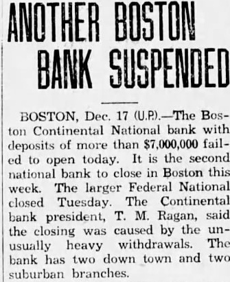 Second National Bank In Boston Is Closed To-day Action Taken to Prevent Heavy Withdrawals Hamden, Conn, Bank Also Closes, Although in Good Shape Boston National Bank. with deposits approximating $7.000, failed to open for business today. It was the second National bank to close in Boston this week. the much Federal Bank having closed Tuesday According to President T. M. Ragan, the Continental National, with two in town and two suburban branches, was closed to protect depositors in the of unusually heavy A notice posted at the bank's entrance read: "Due to extraordinarily heavy caused by general public uneasiness and in order to conserve the assets of the bank, which in the due course of derly should pay all positors in full, directors of the Boston Continental National Bank have asked the controller of the currency take possession of the Boston, Dec deposits $61,701,238 tied by closing of National banks and trust companies. efforts were made to-day to discourage runs on several savings banks. Reminded that never in history has Massa bank been obliged to close, depositors generally refused to become panicky over affecting the other types of banks. But in East Boston, Boston and Lowell, runs had been reported on savings banks. "The banks in East Boston and South Boston, where the runs are being made, are two of the strongest banks in the state,' said State Bank Arthur Guy. "They both in shape and they can't possibly be tired out by run.' Deposits tied up bank closings surpassed the million dollar mark afternoon when the Lowell Trust company of Lowell with on deposit, closed. This was the 10th Massachusetts bank to close within hours, and the 15th New England bank to October After bank commissioner took of the Lowell Trust company at the behest of its officials, the seven savings banks in that important industrial center as precautionary measure, to invoke the 90-day Thus, during the next three months, depositors of these banks will be ableto withdraw not more than $100 each. Herbert Pearson. appointed by the controller of the currency for the Federal National Bank of Boston, to-day was directing the preliminaries to liquidation, with bank officers still asserting that depositors would be paid in full. All the closed banks except the Lowell Trust company were affillates of the Federal National which, with its five Greater Boston branches, closed Tuesday. Hamden. Conn, Dec (UP) The Hamden and Trust pany closed to-day on straining order issued by the state commissioner The action was understood to have been taken to protect deposiThe bank's last statement listed general deposits and savings deposits of $688,000. tal of $200,000, of $75,000 and undivided profits $44,000. Examiner George of the state banking commission. who was the bank's books said the intervened after continued withdrawals by letter had placed the institution in an unlilquid position. was no "run" on the bank, he said. Heavy withdrawal of Christmas savings contributed to the bank's reported these charges as discovthe The article said that the committee had "secured evidence' secret payments money Columbia football that the committee had learned that athletes professional sports in the summer with knowledge of Columbia coaches. that committee had discovered that football players are favored with Columbia university scholarships and that one of the stars of the team was being supplied by money by "a friend of Columbia, president, said. He gave the following figures on the bank's funds at the time of its closing: Total deposits commercial and savings, $1,500,000, savings, $1,500,000, savings, $700,000. and undivided prefits( $44,000. Included in deposits are funds collected by the town tax collector. am convinced that depositors will receive every dollar deposited when the bank's finances are adBroadbent said. 'Inability to liquidate real estate and lateral loans and the depreciation of securities helped bring on the closing, he added. The bank has about 5,000 depositors. Hartford, Conn. Dec 17-(UP) Banking Commissioner George Bassett issued the following statement today the closing of the Hamden Bank and Trust Company. 'Due to inability to collect immediately certain loans which were in badly frozen condition and also due to the recent shrinkage in the market value of securities carried in the bank's portfolio, the officers of the bank found they unable to meet withdrawals and therefore for better protection of all their depositors the restraining order was placed. believed that the savings are well protected securities segregated in that department. Commissioner Bassett said the bank had total assets of $2,395,478.41 as of Sept 30, 1930.