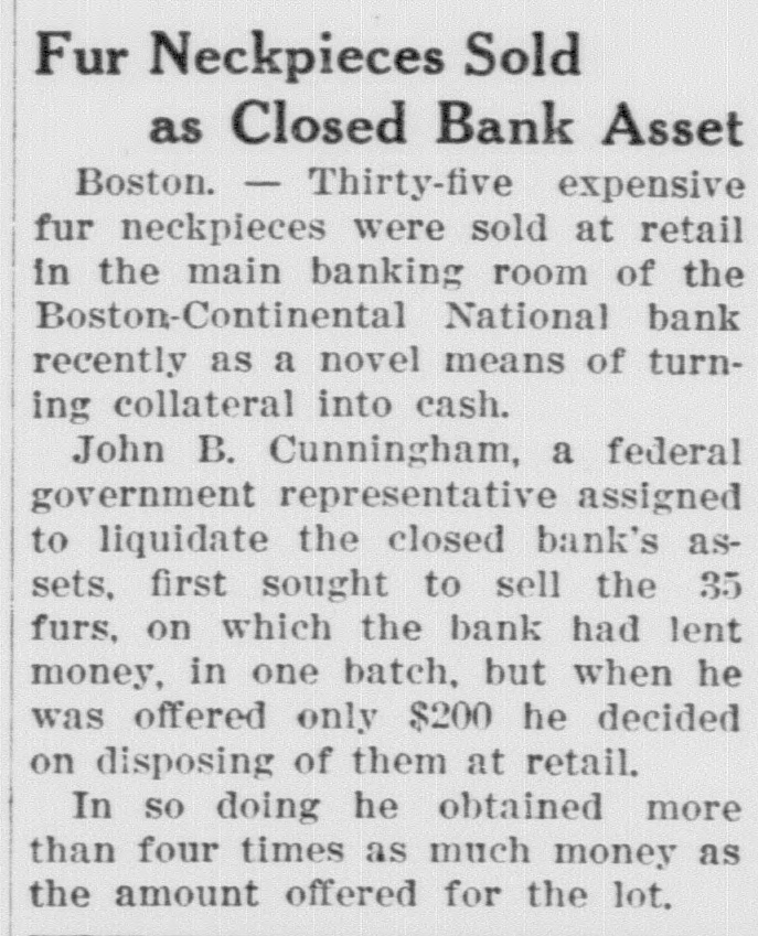 Fur Neckpieces Sold as Closed Bank Asset Boston. - Thirty-five expensive fur neckpieces were sold at retail in the main banking room of the Boston-Continental National bank recently as a novel means of turning collateral into cash. John B. Cunningham, a federal government representative assigned to liquidate the closed bank's assets, first sought to sell the 35 furs, on which the bank had lent money, in one batch, but when he was offered only $200 he decided on disposing of them at retail. In so doing he obtained more than four times as much money as the amount offered for the lot.