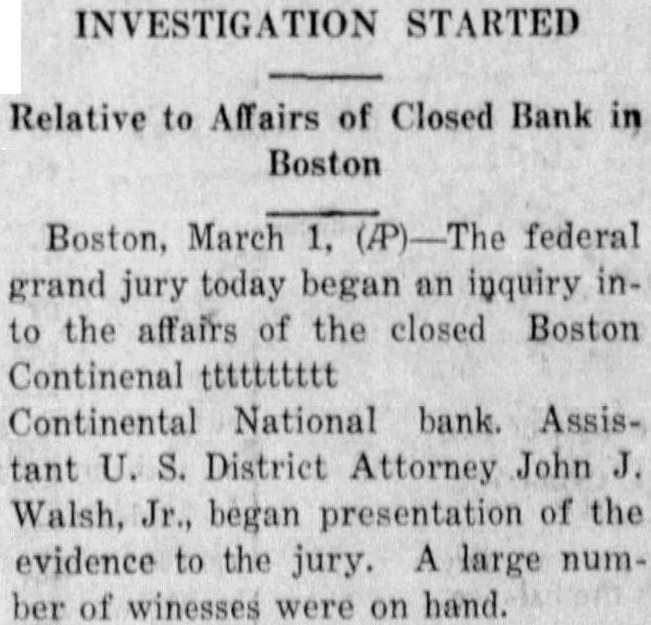 INVESTIGATION STARTED Relative to Affairs of Closed Bank in Boston Boston, March 1, federal grand jury today began an inquiry into the affairs of the closed Boston Continental National bank. Assistant U. S. District Attorney John J. Walsh, Jr., began presentation of the evidence to the jury. A large number of winesses were on hand.