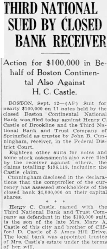 THIRD NATIONAL SUED BY CLOSED BANK RECEIVER Action for $100,000 in Behalf of Boston Continental Also Against H. C. Castle. BOSTON. Sept. 12-(AP) Suit for nearly $100,000 on notes held by the closed Boston Continental National Bank was filed today against Henry C. Castle of Brookline and the Third National Bank and Trust Company of Springfield as trustee by John B. Cunningham, receiver, in the Federal District Court. Eighteen other suits for notes and some stock assessments also were filed by the receiver against others, the claims totalling $196,118, including the Castle claim. Cunningham disclosed in the declarations that the comptroller of the currency has assessed stockholders of the closed bank $1,000,000 on their capital shares. Henry C. Castle, named with the Third National Bank and Trust Company as defendant in the $100,000 suit. is the son of the late Mrs. Mary A. Castle of this city and brother of Clifford D. Castle of Ames Hill Drive. The local bank was appointed trustee of Mrs. Castle's estate under the terms of her will.
