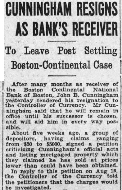 CUNNINGHAM RESIGNS AS BANK'S RECEIVER To Leave Post Settling Boston-Continental Case After many months as receiver of the Boston Continental National Bank of Boston, John B. Cunningham yesterday tendered his resignation the of Mr Cunningham said that he will remain in office until his successor is chosen, and will aid him in every way pos. sible. About five weeks ago, group of depositors, having claims ranging from $50 to $5000, signed petition criticizing Cunningham's official acts and listing mortgaged property which they claimed he has sold at prices than could have been obtained. In reply to this petition on Aug told the Controller the Currency the petitioners that the charges would be investigated.