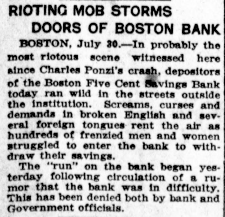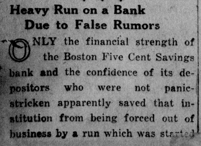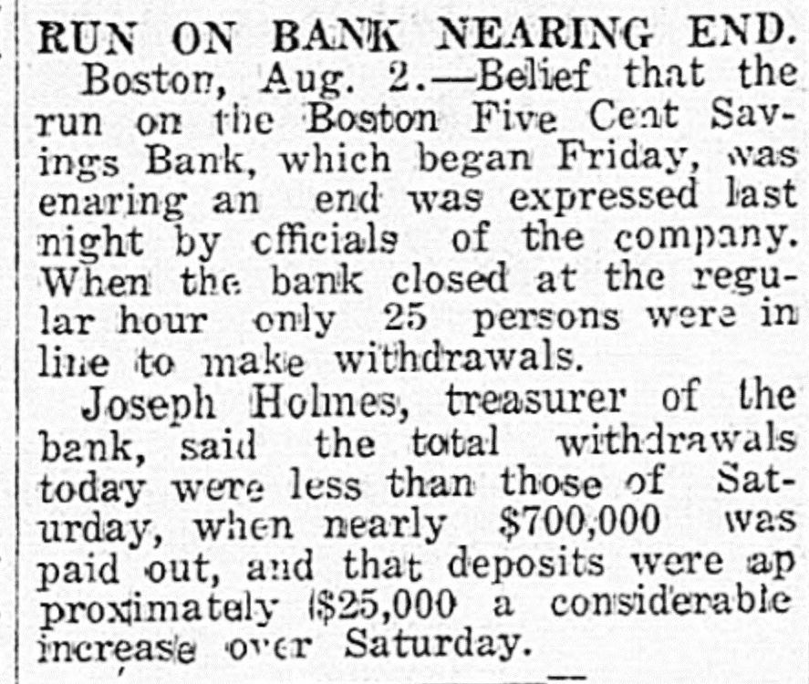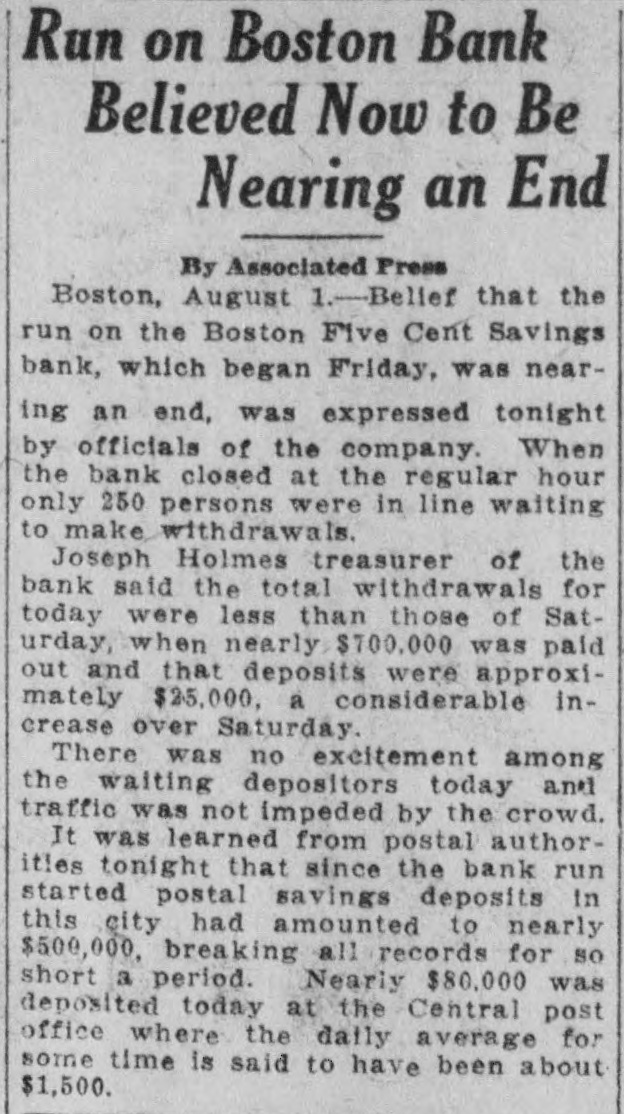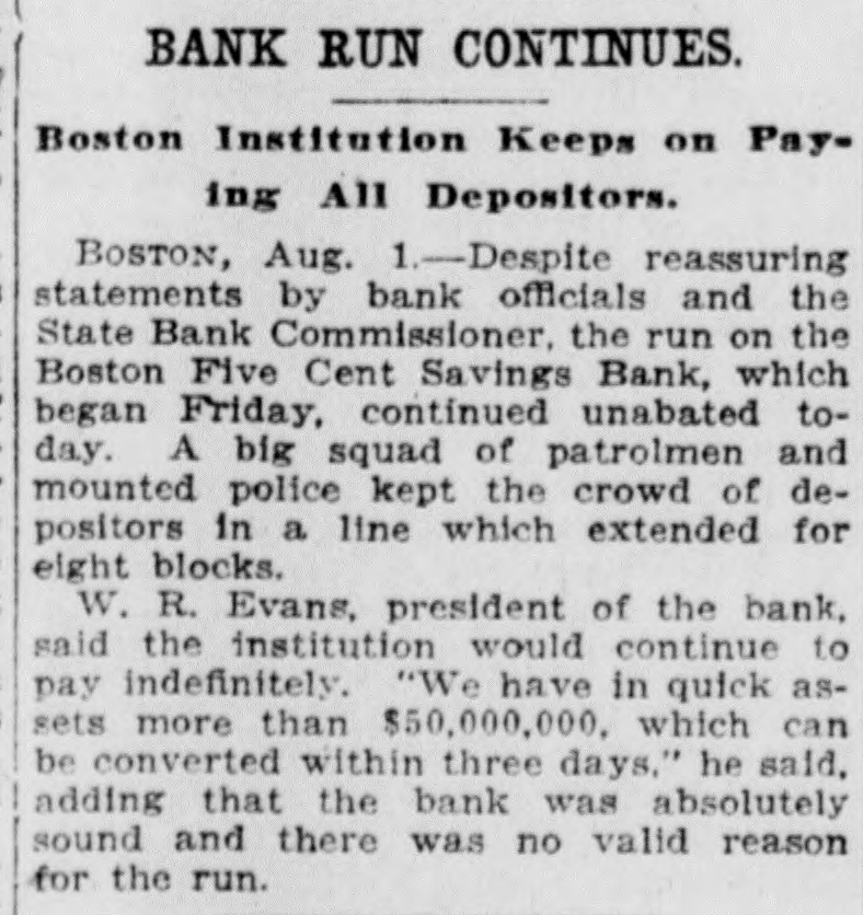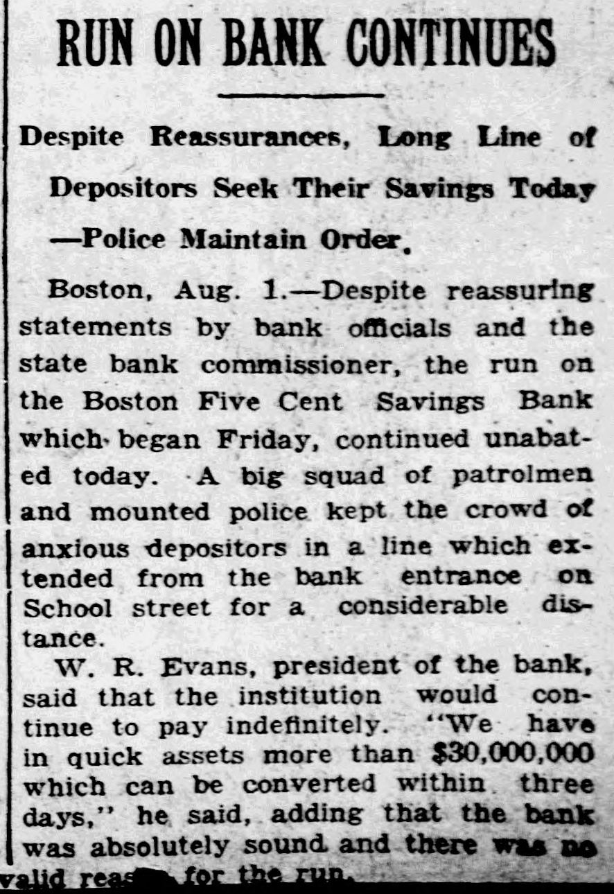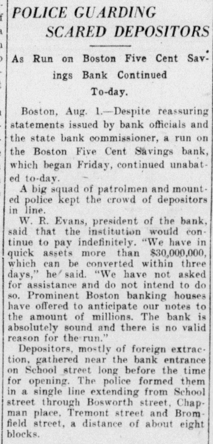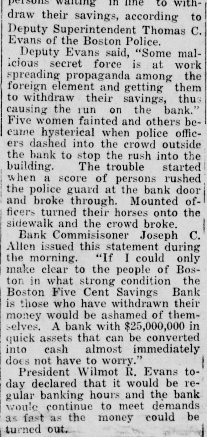 RUNS ON TWO BANKS EASILY WEATHERED Savings Institution in Boston and Trust Company in Philadelphia Safe. BOSTON, July 30.-One hundred and fifteen deposits, aggregating $3,500, were received at the Boston Five Cent Savings Bank this afternoon, its president, Wilmot R. Evans, announced late to-day. The fact that there were from old depositors, together with an easing off in demands noticed before the bank closed at its regular hour, 2 o'clock, led officials of the institution to believe the end of the run, which caused much excitement to-day, was in sight. The bank, as usual on Saturdays, was open from 3 to 5 and from 6 to 8 P. M. to receive deposits. Mr. Evans said that $700,000 had been paid to depositors and that the bank was prepared to meet all demands without outside assistance. Offers of $5,000,000 had been received, in addition to tenders of aid from many banks. Policemen were stationed at each end of School street, in which, almost opposite City Hall. the bank is located, with orders to keep a strict lookout for any persons spreading malicious propaganda regarding the financial condition of the institution. It is to such rumors that the police and bank officers attribute the run. The depositors who withdrew their money were principally of foreign origin. Bank Commissioner Joseph C. Allen reiterated his assurances of the bank's integrity and added: "It has been reported to me that the withdrawals in the Five-cent Savings Bank are the result of propaganda circulated systematically. This report is being investigated by the State authorities and if it is found to be true the public may rest assured that every effort will be made to bring the perpetrators to justice." Mounted police and patrolmen were needed to-day to control the crowds that filled the narrow streets. Fainting women and rushes of men on the cue of anxious depositors caused great difficulty in keeping order. The street was finally closed to those having no definite business there and after the bank's closing hour normal conditions returned.