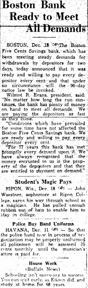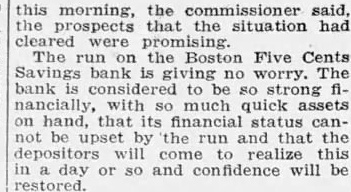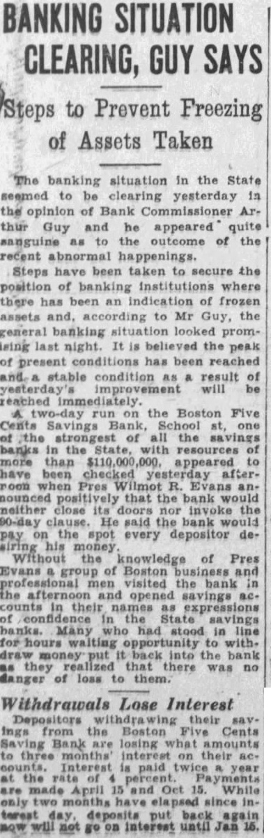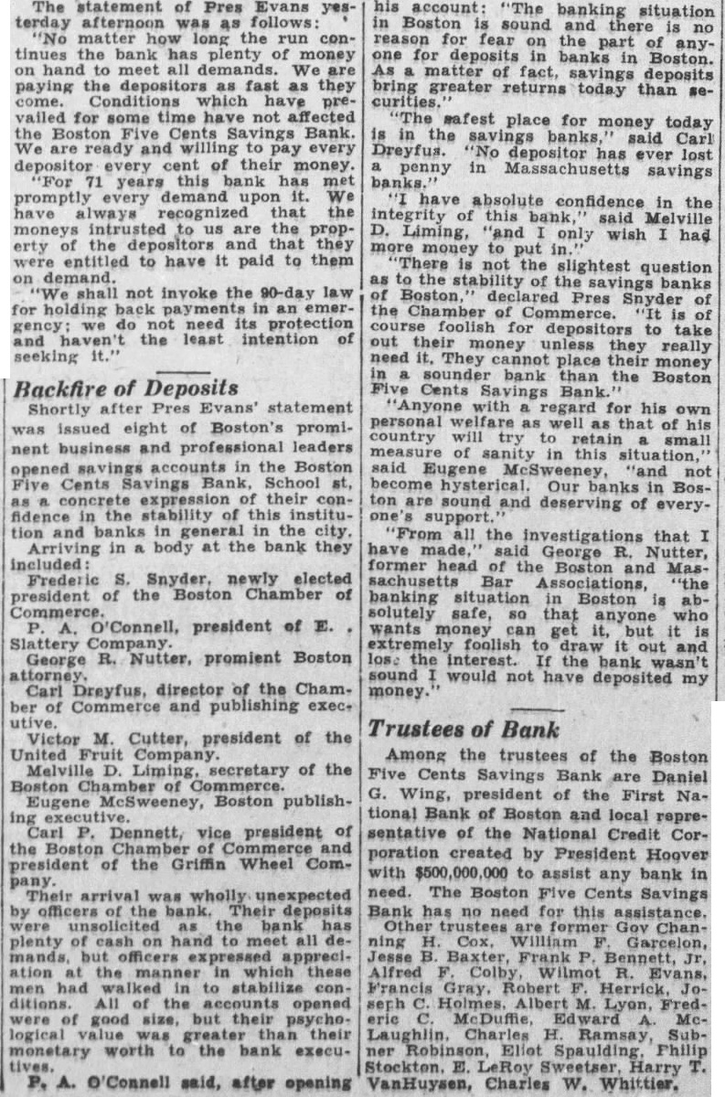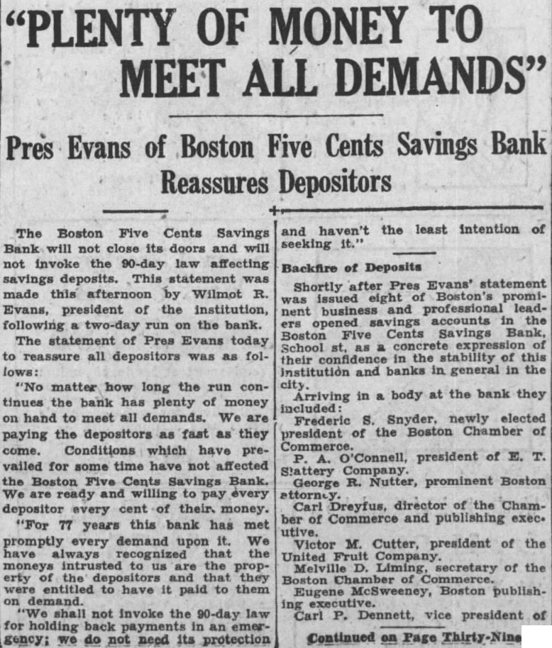 'PLENTY OF MONEY TO MEET ALL DEMANDS" Pres Evans of Boston Five Cents Savings Bank Reassures Depositors The Boston Five Cents Savings Bank will not close its doors and will not invoke the 90-day law affecting savings deposits. This statement was made this afternoon by Wilmot R. Evans, president of the institution, following two-day run on the bank. The statement of Pres Evans today to reassure all depositors was as follows: "No matter how long the run continues the bank has plenty of money on hand to meet all demands. We are paying the depositors as fast as they come. Conditions which have prevailed for some time have not affected the Boston Five Cents Savings Bank. We are ready and willing to pay every depositor every cent of their. money. "For 77 years this bank has met promptly every demand upon it. We have always recognized that the moneys intrusted to us are the property of the depositors and that they were entitled to have it paid to them on demand. "We shall not invoke the 90-day law for holding back in an emergency; we do not need its protection and haven't the least intention of seeking it." Backfire of Deposits Shortly after Pres Evans' statement was issued eight of Boston's prominent business and professional leaders opened savings accounts in the Boston Five Cents Savings Bank, School st, as a concrete expression of their confidence in the stability of this institution and banks in general in the city Arriving in a body at the bank they included: Frederic S. Snyder, newly elected president of the Boston Chamber of Commerce. P. A. O'Connell, president of E. T. George R. Nutter, prominent Boston attorney Carl Dreyfus, director of the Chamber of Commerce and publishing exec. utive. Victor M. Cutter, president of the United Fruit Company Melville D. Liming, secretary of the Boston Chamber of Commerce. Eugene McSweeney, Boston publishing Carl P. Dennett, vice president of Continued on Page Thirty-Nine