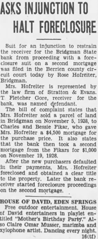 Suit for an injunction to restrain the receiver for the Bridgman State bank from proceeding with foreclosure suit on second mortgage filed the Berrien court today by Rose Hofreiter, Bridgman. Mrs. Hofreiter represented by firm of Stratton Evans. Fletcher Gore, receiver for the bank, was named defendant. states that Mrs. Hofreiter sold parcel Bridgman 1928, to Charles Bessie Fikar, who gave Mrs. Hofreiter $4,500 mortgage for the purchase price. also states the bank took second mortgage from the Fikars for $1,000 19, 1928. After the new defaulted their Mrs. Hofreiter and obtained clear title the property. Later the bank started foreclosure proceedings on the second mortgage.