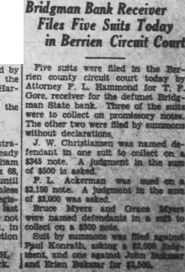 Two Suits Filed Today by Bridgman Bank Receiver ... Gore today brought two suits in circuit court on behalf of the old Bridgman State bank, for which he is receiver.