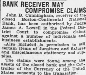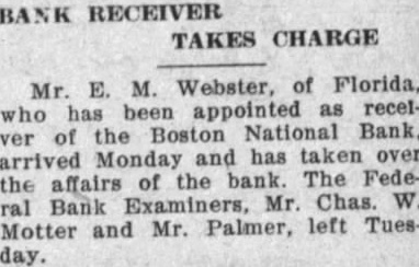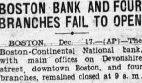 BOSTON BANK CLOSES BOSTON, Dec. National bank, offices on Devonshire main downtown Boston, and street, branches, remained closed at four today, the customary time. notice posted opening that the controller of currency had been asked to take it over to the assets, owing to conserve heavy demands by depositors. the time the consolidaAt Boston National bank tion the Continental National with the about ago the combank year bined deposits of the merged stitutions given approxi$9,500,000 and the mately bined were set at 000,000. The Continental originalthe Engineers' National was bank, but its name was changed after the Brotherhood Locomotive Engineers relinquished trol affairs. The the 13th New England bank to close its doors period of four days.