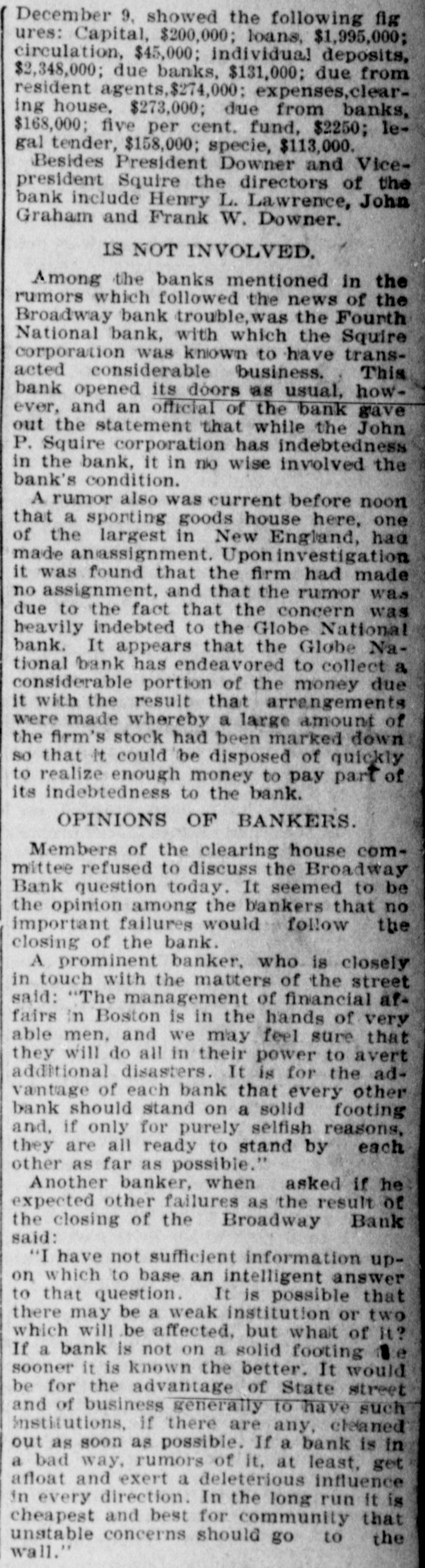 December 9. showed the following fig ures: Capital, $200,000; loans, $1,995,000; circulation, $45,000; individual deposits, $2,348,000; due banks, $131,000; due from resident agents,$274,000; expenses,clearing house, $273,000; due from banks, $168,000; five per cent. fund, $2250; legal tender, $158,000; specie, $113,000. Besides President Downer and Vicepresident Squire the directors of the bank include Henry L. Lawrence, John Graham and Frank W. Downer. IS NOT INVOLVED. Among the banks mentioned in the rumors which followed the news of the Broadway bank trouble, was the Fourth National bank, with which the Squire corporation was known to have transacted considerable business. This bank opened its doors as usual, however, and an official of the bank gave out the statement that while the John P. Squire corporation has indebtedness in the bank, it in no wise involved the bank's condition. A rumor also was current before noon that a sporting goods house here, one of the largest in New England, had made anassignment. Uponinvestigation it was found that the firm had made no assignment, and that the rumor was due to the fact that the concern was heavily indebted to the Globe National bank. It appears that the Globe National bank has endeavored to collect a considerable portion of the money due it with the result that arrangements were made whereby a large amount of the firm's stock had been marked down so that it could be disposed of quickly to realize enough money to pay part of its indebtedness to the bank. OPINIONS OF BANKERS. Members of the clearing house committee refused to discuss the Broadway Bank question today. It seemed to be the opinion among the bankers that no important failures would follow the closing of the bank. A prominent banker, who is closely in touch with the matters of the street said: "The management of financial affairs in Boston is in the hands of very able men, and we may feel sure that they will do all in their power to avert additional disasters. It is for the advantage of each bank that every other bank should stand on a solid footing and, if only for purely selfish reasons, they are all ready to stand by each other as far as possible." Another banker, when asked if he expected other failures as the result of the closing of the Broadway Bank said: "I have not sufficient information upon which to base an intelligent answer to that question. It is possible that there may be a weak institution or two which will be affected. but what of it? If a bank is not on a solid footing e sooner it is known the better. It would be for the advantage of State street and of business generally to have such institutions, if there are any, cleaned out as soon as possible. If a bank is in a bad way, rumors of it, at least, get afloat and exert a deletérious influence in every direction. In the long run it is cheapest and best for community that unstable concerns should go to the wall."
