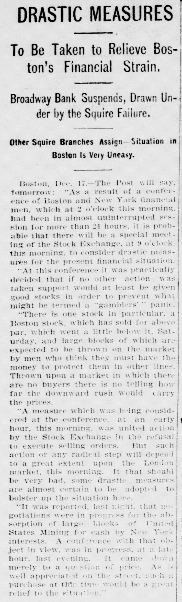 DRASTIC MEASURES To Be Taken to Relieve Boston's Financial Strain. Broadway Bank Suspends, Drawn Under by the Squire Failure. Other Squire Branches Assign-Situation in Boston Is Very Uneasy. Boston, Dec. 17.-The Post will say, tomorrow: "As a result of a conference of Boston and New York financial men, which at 2 o'clock this morning, had been in almost uninterrupted session for more than 24 hours, it is probable that there will be a special meeting of the Stock Exchange, at 9 o'clock. this morning. to consider drastic measures for the present financial situation. "At this conference it was practically decided that if no other action was taken support would at least be given good stocks in order to prevent what might be termed a "gamblers" panic. "There is one stock in particular, a Boston stock. which has sold for above par, which went a little below it. Saturday, and large blocks of which are expected to be thrown on the market by men who think they must have the money to protect them in other lines. Thrown upon a market in which there are no buyers there is no telling how far the downward rush would carry the prices. "A measure which was being considered at the conference. at an early hour, this morning. was united action by the Stock Exchange in the refusal to execute selling orders. But such action or any radical step will depend to a great extent upon the London market, this morning. It that should be very bad. some drastic measures are almost certain to be adopted to bolster up the situation here. "It was reported, last night, that negotiations were in progress for the absorption of large blocks of United States Mining for cash by New York interests. A conference with that object in view. was in progress. at a late hour, last evening. It came down merely to a question of price. As is well appreciated on the street, such a purchase at this time would be a great relief to the situation."