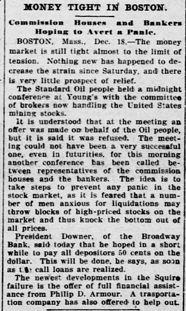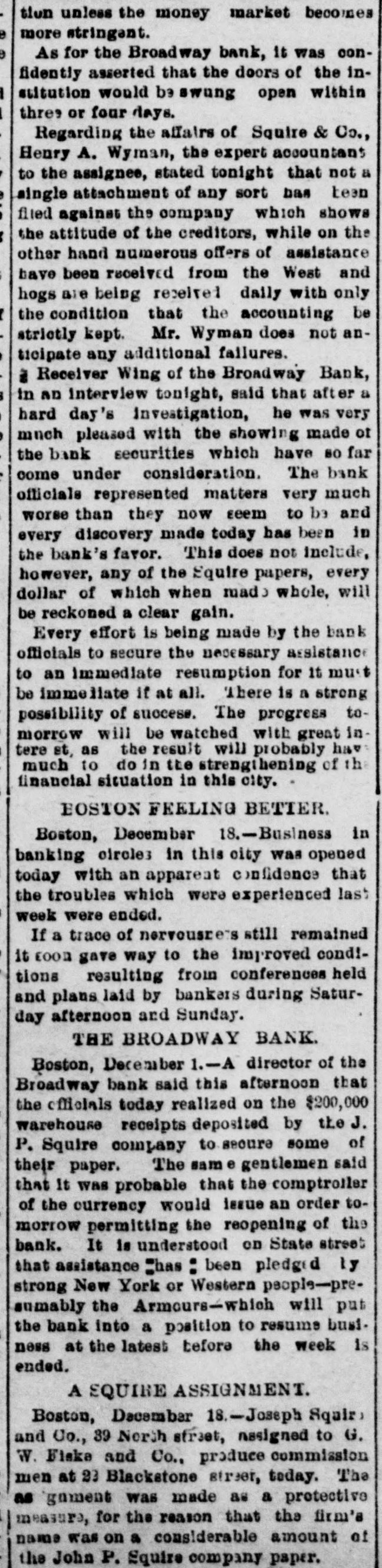 tion unless the money market becomes more stringent. As for the Broadway bank, it was confidently asserted that the doors of the institution would be swung open within three or four days. Regarding the affairs of Squire & Co., Henry A. Wyman, the expert accountant to the assignee, stated tonight that not a single attachment of any sort has been filed against the company which shows the attitude of the creditors, while on the other hand numerous offers of assistance have been received from the West and hogs are being received daily with only the condition that the accounting be strictly kept. Mr. Wyman does not anticipate any additional failures. il Receiver Wing of the Broadway Bank, in AD interview tonight, said that after a hard day's investigation, he was very much pleased with the showing made of the bank securities which have 80 far come under consideration. The bank officials represented matters very much worse than they now seem to be and every discovery made today has been in the bank's favor. This does not include, however, any of the Equire papers, every dollar of which when made whole, will be reckoned a clear gain. Every effort is being made by the bank officials to secure the necessary assistance to an immediate resumption for It must be immeliate if at all. There is a strong possibility of success. The progress tomorrow will be watched with great intere st, as the result will probably have much to do in the strengthening of the financial situation in this city. BOSTON FEELING BETTER. Boston, December 18.-Business in banking circles in this city was opened today with an apparent confidence that the troubles which were experienced last week were ended. If a trace of nervousre's still remained it coon gave way to the improved cond!tions resulting from conferences held and plans laid by bankers during Saturday afternoon and Sunday. THE BROADWAY BANK. Boston, December 1.-A director of the Broadway bank said this afternoon that the officials today realized on the $200,000 warehouse receipts deposited by the J. P. Squire company to secure some of their paper. The sam e gentlemen said that It was probable that the comptroller of the currency would issue an order tomorrow permitting the reopening of the bank. It is understood on State street that assistance :has : been pledged ly strong New York or Western people-presumably the Armours-which will put the bank into a position to resume business at the latest before the week is ended. A EQUIRE ASSIGNMENT. Boston, December 18.-Joseph Squir, and Co., 39 North street, nasigned to G. W. Fiske and Co., produce commission men at 23 Blackstone street, today. The as gament was made as a protective measure, for the reason that the firm's name was on & considerable amount of the John P. Squire company paper.