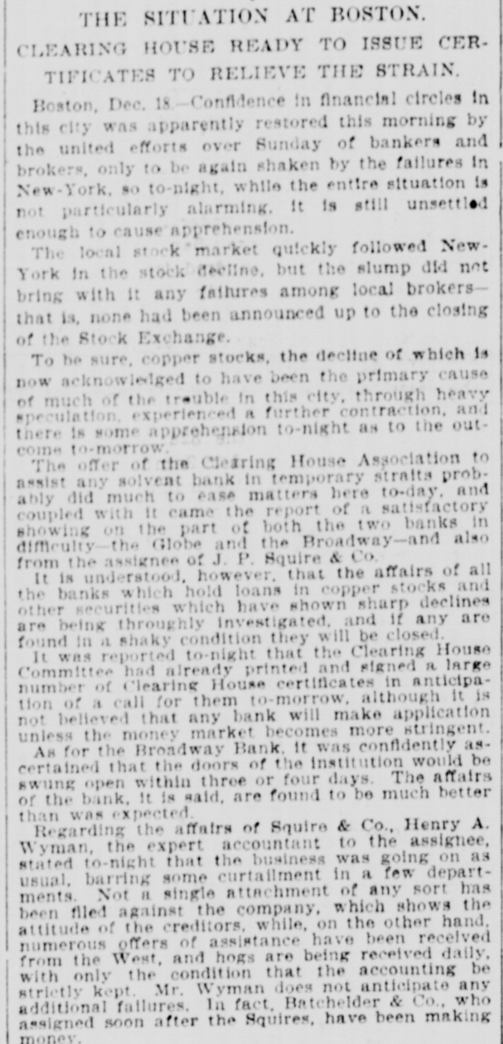 THE SITUATION AT BOSTON. CLEARING HOUSE READY TO ISSUE CERTIFICATES TO RELIEVE THE STRAIN. Boston, Dec. 18.-Confidence in financial circles in this city was apparently restored this morning by the united efforts over Sunday of bankers and brokers, only to be again shaken by the failures In New-York, so to-night, while the entire situation is not particularly alarming. It is still unsettled enough to cause apprehension. The local stock market quickly followed NewYork in the stock decline, but the slump did not bring with It any fathures among local brokersthat is, none had been announced up to the closing of the Stock Exchange. To be sure, copper stocks, the decline of which is now acknowledged to have been the primary cause of much of the treuble in this city, through heavy speculation. experienced a further contraction, and there is some apprehension to-night as to the outcome to-morrow. The offer of the Clearing House Association to assist any solvent bank in temporary straits probably did much to ease matters here to-day, and coupled with It came the report of a satisfactory showing on the part of both the two banks in difficulty-the Globe and the Broadway-and also from the assignee of J. P. Squire & Co. It is understood, however, that the affairs of all the banks which hold loans in copper stocks and other securities which have shown sharp declines are being throughly investigated, and if any are found in it shaky condition they will be closed. It was reported to-night that the Clearing House Committee had already printed and signed a large number of Clearing House certificates in anticipation of a call for them to-morrow, although it is not believed that any bank will make application unless the money market becomes more stringent. As for the Broadway Bank, it was confidently ascertained that the doors of the institution would be swung open within three or four days. The affairs of the bank, It is said, are found to be much better than was expected. Regarding the affairs of Squire & Co., Henry A. Wyman, the expert accountant to the assignee, stated to-night that the business was going on as usual, barring some curtailment in a few departments. Not 8. single attachment of any sort has been filed against the company, which shows the attitude of the creditors, while, on the other hand, numerous offers of assistance have been received from the West, and hogs are being received daily, with only the condition that the accounting be strictly kept. Mr. Wyman does not anticipate any additional failures. In fact, Batchelder & Co., who assigned soon after the Squires, have been making money.