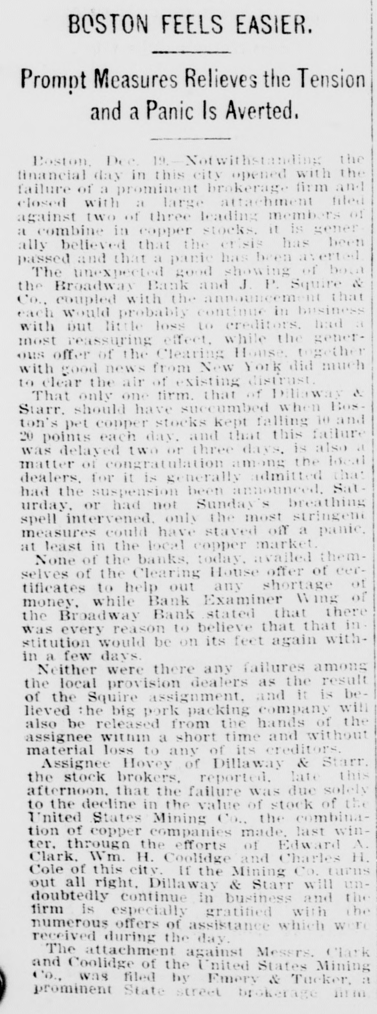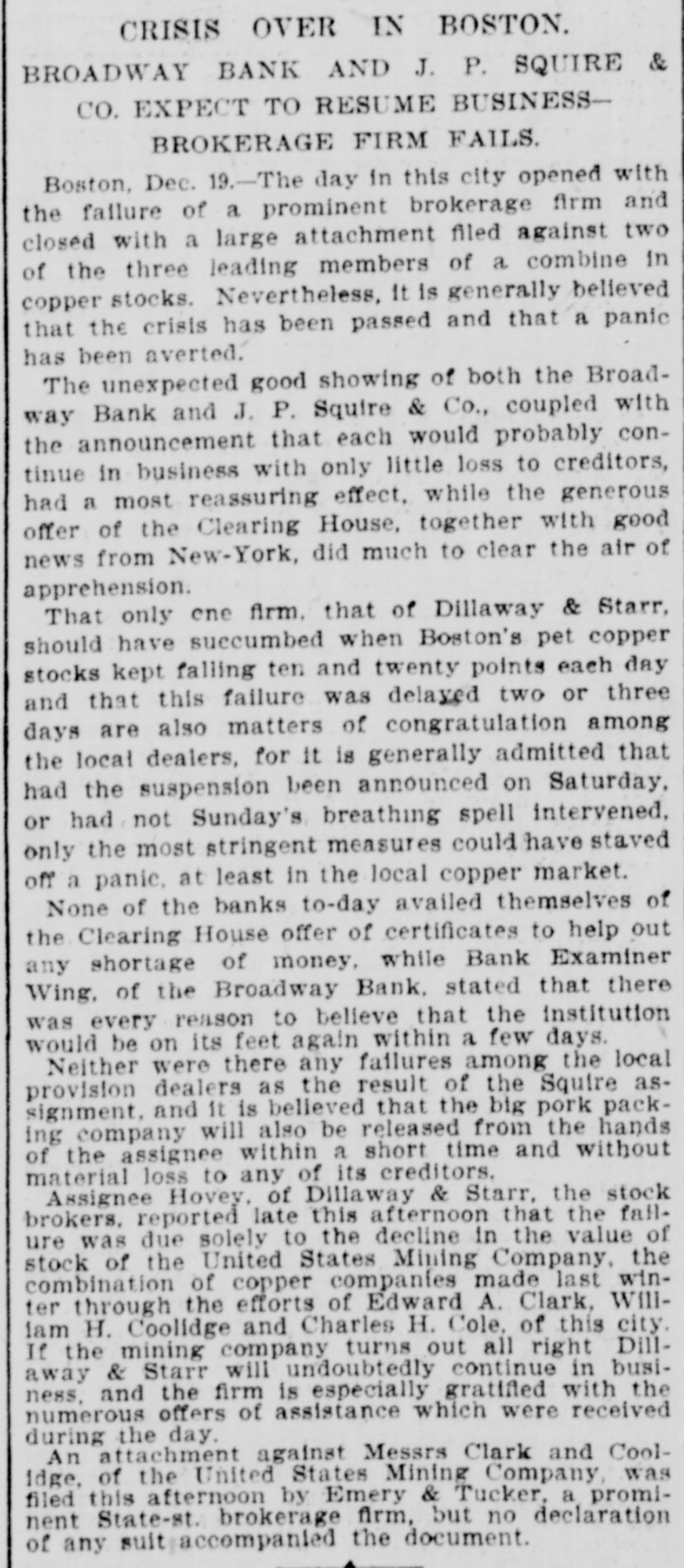 CRISIS OVER IN BOSTON. BROADWAY BANK AND J. P. SQUIRE & CO. EXPECT TO RESUME BUSINESSBROKERAGE FIRM FAILS. Boston, Dec. 19.-The day in this city opened with the failure of a prominent brokerage firm and closed with a large attachment filed against two of the three leading members of a combine in copper stocks. Nevertheless, it is generally believed that the crisis has been passed and that a panic has been averted. The unexpected good showing of both the Broadway Bank and J. P. Squire & Co., coupled with the announcement that each would probably continue in business with only little loss to creditors, had a most reassuring effect, while the generous offer of the Clearing House, together with good news from New-York, did much to clear the air of apprehension. That only one firm. that of Dillaway & Starr, should have succumbed when Boston's pet copper stocks kept falling ten and twenty points each day and that this failure was delayed two or three days are also matters of congratulation among the local dealers, for it is generally admitted that had the suspension been announced on Saturday, or had not Sunday's breathing spell intervened, only the most stringent measures could have staved off a panie, at least in the local copper market. None of the banks to-day availed themselves of the Clearing House offer of certificates to help out any shortage of money, while Bank Examiner Wing, of the Broadway Bank, stated that there was every reason to believe that the institution would be on its feet again within a few days. Neither were there any failures among the local provision dealers as the result of the Squire assignment, and it is believed that the big pork packing company will also be released from the hands of the assignee within a short time and without material loss to any of its creditors. Assignee Hovey, of Dillaway & Starr, the stock brokers, reported late this afternoon that the failure was due solely to the decline in the value of stock of the United States Mining Company, the combination of copper companies made last winter through the efforts of Edward A. Clark, William H. Coolidge and Charles H. Cole, of this city. If the mining company turns out all right Dillaway & Starr will undoubtedly continue in business, and the firm is especially gratified with the numerous offers of assistance which were received during the day. An attachment against Messrs Clark and Coolidge, of the United States Mining Company, was filed this afternoon by Emery & Tucker, a prominent State-st. brokerage firm, but no declaration of any suit accompanied the document.