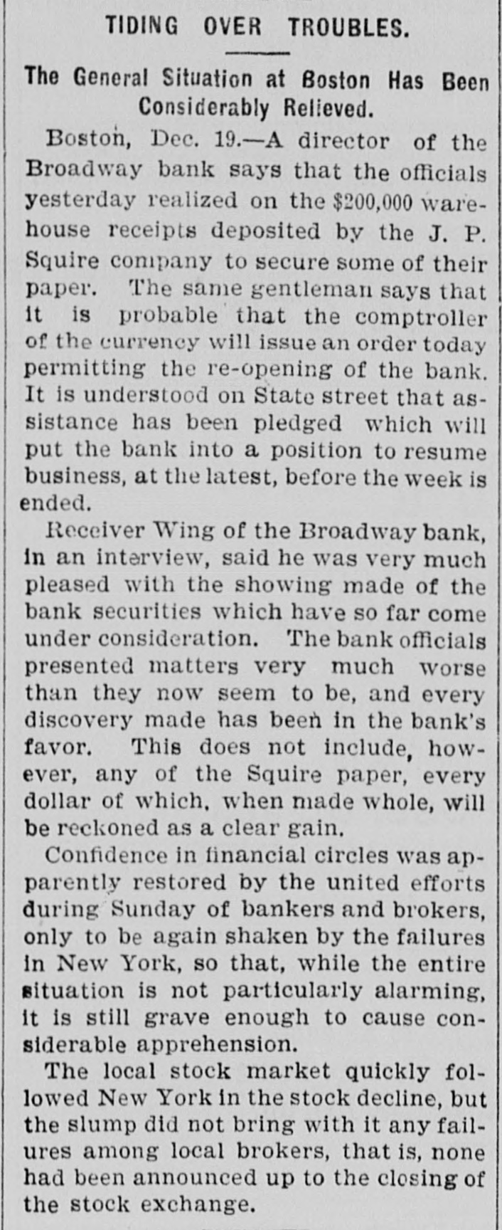 TIDING OVER TROUBLES. The General Situation at Boston Has Been Considerably Relieved. Boston, Dec. 19.-A director of the Broadway bank says that the officials yesterday realized on the $200,000 warehouse receipts deposited by the J. P. Squire company to secure some of their paper. The same gentleman says that it is probable that the comptroller of the currency will issue an order today permitting the re-opening of the bank. It is understood on State street that assistance has been pledged which will put the bank into a position to resume business, at the latest, before the week is ended. Receiver Wing of the Broadway bank, in an interview, said he was very much pleased with the showing made of the bank securities which have so far come under consideration. The bank officials presented matters very much worse than they now seem to be, and every discovery made has been in the bank's favor. This does not include, however, any of the Squire paper, every dollar of which, when made whole, will be reckoned as a clear gain. Confidence in financial circles was apparently restored by the united efforts during Sunday of bankers and brokers, only to be again shaken by the failures in New York, so that, while the entire situation is not particularly alarming, it is still grave enough to cause considerable apprehension. The local stock market quickly followed New York in the stock decline, but the slump did not bring with it any failures among local brokers, that is, none had been announced up to the closing of the stock exchange.
