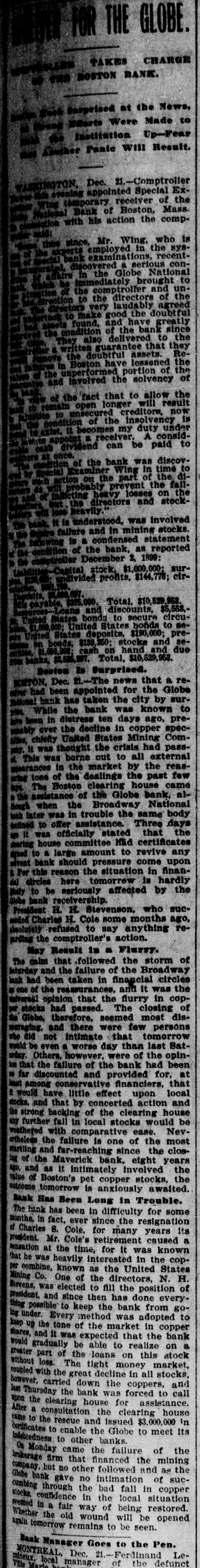 FROM THE TAKES CHARGE BANK. NOTSON 'SMON em so panisdang 03 open Mere awag-dì Result IIIM Paula jousey Dec. evening appointed Special Extemporary receiver of the SUIAL Bank of Boston, Mass. with his action the comp#1 oum 'SUIAI NPI -SAN our up sup examinations, recentdiscovered serious conthe Globe National immediately brought to -un pus our to the directors of the very laudably agreed injignop am poor exwer Breathy элиц pus 'punos condition of the bank since am 01 OS[V written guarantee that they doubtful assets. ReBoston have lessened the unperformed portion of the 10 AQUATOR our puw the fact that to allow the result IIIM uedo unsecured creditors, now of the insolvency is becomes my duty under receiver. A consid01 plud eq use puoplaip -AOOSID SUM queq our JO Examiner Wing in time to -IP the 10 part our -11% our prevent no heavy losses on the stook- pus discorts our SEAL protection ## failure and in mining stocks. statement pesuepuoo . #1 of the bank, as reported :668T % December -Jns :000'000'18 state -ajo program, pepian Total. $10,529,958 and discounts, $5,553,States bonds to secure circu-00 03 spuoq States Penjun States deposits, $190,000; pre-08 pus stools 6218 bonds, enp pus pueu uo cash Total "I MORROE BOSTON, Dec. fl-The news that a reour JOJ appointed useq pen National bank has taken the city by sur07 umoun SEAL yueq our "ПЧА been in distress ten days ago, pre-oads Jeddoo up deelline em JOAD Signature sities, chiefly United States Mining Com-ssed pay crists eq: SUM $ AUN external 118 01 ano burre SUM THIS P spearances in the market by the reasMOI asst our our to euo) your The Boston clearing house came new -18 after em: 10 assistance National Broadmay eq1 usqu bank later was in trouble the same body delined to offer assistance. Three days It was officially stated that the cortificate PEH committee esnoy Aue 01 funours Isree . 03 pours selvent bank should pressure come upon For this reason the situation in finandircles here tomorrew is hardly the sq eq 01 April queq and -one oum H H 'oSe should euros Cole H paper absolutely refused to say anything reaction. em Suppret - up ANN The calm that followed the storm of Inturday and the failure of the Broadway lank had been taken in financial circles the SBM # Due requerements our 30 euo . miversal opinion that the flurry in copper stocks had passed. The closing of the Globe, therefore, seemed most discoaraging. and there were few persons who did not intimate that tomorrow would be even a worse day than last Saturday. Others, however, were of the opinlon that the failure of the bank had been 80 far discounted and provided for, at that Sucure it would have little effect upon local stocks. and that by concerted action and the strong backing of the clearing house any further fall in local stocks would be weathered with comparative ease. Nevartheless the failure is one of the most startling and far-reaching since the closing of the Maverick bank, eight years the Internety # se puw '02's value of Boston's pet copper stocks, the outcome tomorrow is anxiously awaited. Bank Has Been Long in Trouble. The bank has been in difficulty for some months, in fact, ever since the resignation of Charles S. Cole, for many years Its premident. Mr. Cole's retirement caused a sensation at the time, for It was known that he was heavily interested in the copper combine, known as the United States Mining Co. One of the directors, N. H. JO postion the IIV 01 eleeted SUM president, and since then has done everything possible to keep the bank from going under. Every method was adopted to Jeddoo up market the 10 the em on deex shares, and it was expected that the bank B uo realize of able eq place greater part of the loans on this stock without loss. The tight money market, coupled with the great decline in all stocks, however, carried down the coppers, and last Thursday the bank was forced to call upon the clearing house for assistance. After a consultation the clearing house u, 000'000'2$ penssi pue researe the 01 email certificates to enable the Globe to meet its indebtedness to other banks On Monday came the failure of the brokerage firm that financed the mining company but no other followed and as the -ons JO ou are queq Globa cumbing through the bad fall in copper stocks. confidence in the local situation restored beling JO ABM JJRJ e up petroas peuedo eq IIIM рипом plo the usess