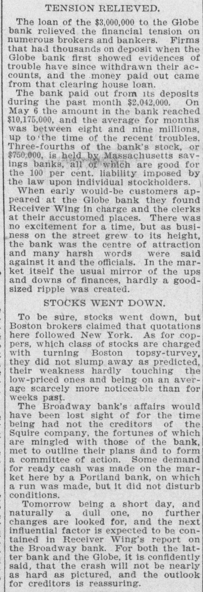 TENSION RELIEVED. The loan of the $3,000,000 to the Globe bank relieved the financial tension on numerous brokers and bankers. Firms that had thousands on deposit when the Globe bank first showed evidences of trouble have since withdrawn their accounts, and the money paid out came from that clearing house loan. The bank paid out from its deposits during the past month $2,042,000. On May 6 the amount in the bank reached $10,175,000, and the average for months was between eight and nine millions, up to'the time of the recent troubles. Three-fourths of the bank's stock, or $750,000, is held by Massachusetts savings banks, all of which are good for the 100 per cent. liability imposed by the law upon individual stockholders. When early would-be customers appeared at the Globe bank they found Receiver Wing in charge and the clerks at their accustomed places. There was no excitement for a time, but as business on the street grew to its height, the bank was the centre of attraction and many harsh words were said against it and the officials. In the market itself the usual mirror of the ups and downs of finances, hardly a goodsized ripple was created. STOCKS WENT DOWN. To be sure, stocks went down, but Boston brokers claimed that quotations here followed New York. As for coppers, which class of stocks are charged with turning Boston topsy-turvey, they did not slump away as predicted, their weakness hardly touching the low-priced ones and being on an average scarcely more noticeable than for weeks past. The Broadway bank's affairs would have been lost sight of for the time being had not the creditors of the Squire company, the fortunes of which are mingled with those of the bank, met to outline their plans and to form a committee of action. Some demand for ready cash was made on the market here by a Portland bank, on which a run was made, but it did not disturb conditions. Tomorrow being a short day, and naturally a dull one, no further changes are looked for, and the next influential factor is expected to be contained in Receiver Wing's report on the Broadway bank. For both the latter bank and the Globe, it is confidently said, that the crash will not be nearly as hard as pictured, and the outlook for creditors is reassuring.