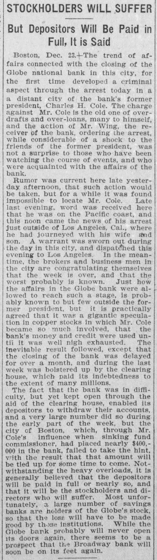 STOCKHOLDERS WILL SUFFER But Depositors Will Be Paid in Full, It is Said Boston, Dec. 23. The trend of affairs connected with the closing of the Globe national bank in this city, for the first time developed a criminal aspect through the arrest today in a a distant city of the bank's former president, Charles H. Cole. The charge against Mr. Cole is the old one of overdrafts and over-loans, many to himself, and the action of Mr. Wing, the receiver of the bank, ordering the arrest, while considerable of a shock to the friends of the former president, was not a surprise to those who have been watching the course of events, and who were acquainted with the affairs of the bank. Rumor was current here late yesterday afternoon, that such action would be taken. but for a while it was found impossible to locate Mr. Cole. Late last evening, word was received here that he was on the Pacific coast, and this noon came the news of his arrest just outside of Los Angeles, Cal., where he had journeyed with his wife and son. A warrant was sworn out during the day in this city, and dispatched this evening to Los Angeles. In the meantime, the brokers and business men in the city are congratulating themselves that the week is over, and that the worst probably is known. Just how the affairs in the Globe bank were allowed to reach such a stage, is probably known to but few outside the former president, but it is practically agreed that it was a gigantic speculation in copper stocks in which Mr. Cole became so much involved, that the bank's money and credit were used untii it was well nigh exhausted. The inevitable result followed, except that the closing of the bank was delayed for over a month, and during the last week was bolstered up by the clearing house, which paid its indebtedness to the extent of many millions. The fact that the bank was in difficulty, but yet kept open through the aid of the clearing house, enabled its depositors to withdraw their accounts, and a very large number did so during the early part of the week, but the city of Boston, which, through Mr. Cole's influence when sinking fund commissioner, had placed nearly $400,000 in the bank, failed to take the hint, with the result that that amount will be tied up for some time to come. Notwithstanding the heavy overloads, it is generally believed that the depositors will be paid in full or nearly so, and that it will be the stockholders and directors who will suffer. Most unfortunately, a large number of savings banks are holders of the Globe's stock, SO that the loss will have to be made good by those institutions. While the Globe bank probably will never open its doors again, there seems to be a prospect that the Broadway bank will soon be on its feet again.