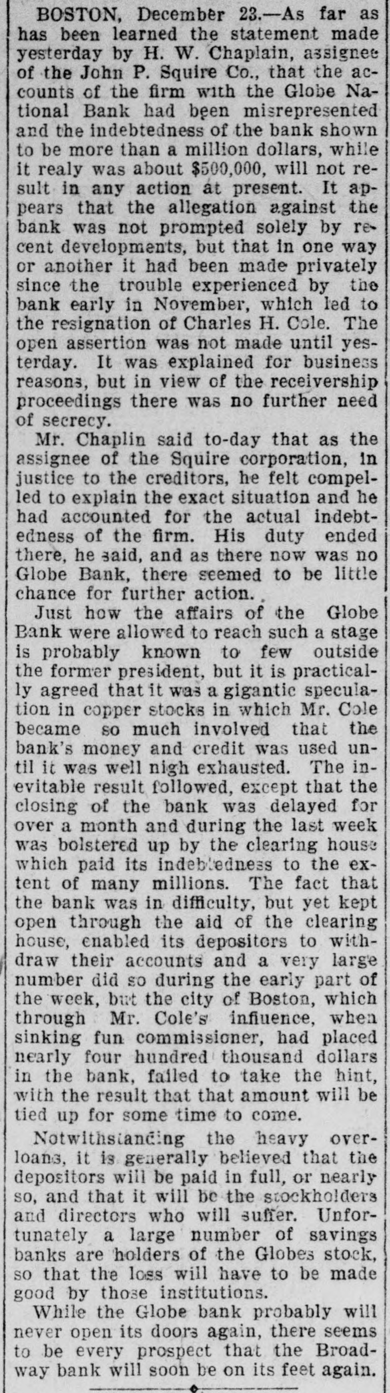 BOSTON, December 23.-As far as has been learned the statement made yesterday by H. W. Chaplain, assignee of the John P. Squire Co., that the accounts of the firm with the Globe National Bank had been misrepresented and the indebtedness of the bank shown to be more than a million dollars, while it realy was about $500,000, will not result in any action at present. It appears that the allegation against the bank was not prompted solely by recent developments, but that in one way or another it had been made privately since the trouble experienced by the bank early in November, which led to the resignation of Charles H. Cole. The open assertion was not made until yesterday. It was explained for business reasons, but in view of the receivership proceedings there was no further need of secrecy. Mr. Chaplin said to-day that as the assignee of the Squire corporation, in justice to the creditors, he felt compelled to explain the exact situation and he had accounted for the actual indebtedness of the firm. His duty ended there, he said, and as there now was no Globe Bank, there seemed to be little chance for further action. Just how the affairs of the Globe Bank were allowed to reach such a stage is probably known to few outside the former president, but it is practically agreed that it was a gigantic speculation in copper stocks in which Mr. Cole became so much involved that the bank's money and credit was used until it was well nigh exhausted. The inevitable result followed, except that the closing of the bank was delayed for over a month and during the last week was bolstered up by the clearing house which paid its indebtedness to the extent of many millions. The fact that the bank was in difficulty, but yet kept open through the aid of the clearing house, enabled its depositors to withdraw their accounts and a very large number did SO during the early part of the week, but the city of Boston, which through Mr. Cole's influence, when sinking fun commissioner, had placed nearly four hundred thousand dollars in the bank, failed to take the hint, with the result that that amount will be tied up for some time to come. Notwithstanding the heavy overloans, it is generally believed that the depositors will be paid in full, or nearly so, and that it will be the stockholders and directors who will suffer. Unfortunately a large number of savings banks are holders of the Globes stock, so that the loss will have to be made good by those institutions. While the Globe bank probably will never open its doors again, there seems to be every prospect that the Broadway bank will soon be on its feet again.
