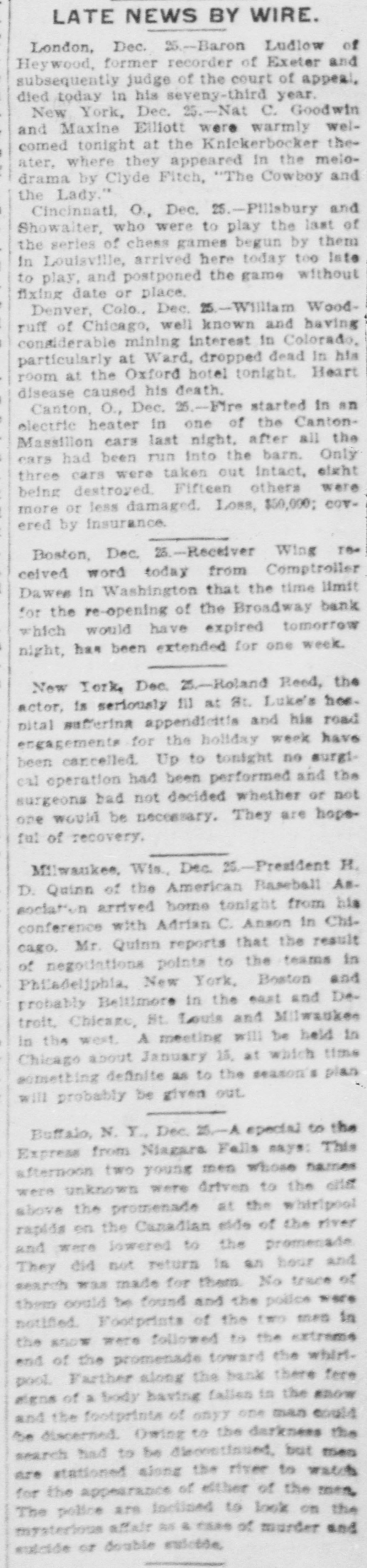 LATE NEWS BY WIRE. London, Dec. 25-Baron Ludlow of Heywood, former recorder of Exeter and subsequently judge of the court of appeal, died today in his seveny-third year. New York, Dec. 25.-Nat C. Goodwin and Maxine Elliott were warmly welcomed tonight at the Knickerbocker theater, where they appeared in the melodrama by Clyde Fitch, "The Cowboy and the Lady." Cincinnati, O, Dec. 25.-Pillsbury and Showalter, who were to play the last of the series of chess games begun by them in Louisville, arrived here today too late to play, and postponed the game without fixing date or place. Denver, Colo., Dec. 25.-William Woodruff of Chicago, well known and having considerable mining interest in Colorado, particularly at Ward, dropped dead In his room at the Oxford hotel tonight. Heart disease caused his death. Canton, O., Dec. 25.-Fire started In an electric heater in one of the CantonMassillon cars last night, after all the cars had been run Into the barn. Only three cars were taken out Intact, eight being destroyed. Fifteen others were more or less damaged. Loss, $50,000; COVered by insurance. Boston, Dec. 25.-Receiver Wing TB* celved word today from Comptroller Dawes in Washington that the time limit for the re-opening of the Broadway bank which would have expired tomorrow night, has been extended for one week. New York, Dec. Z.-Roland Reed, the actor, is seriously III at St. Luke's hos. nital auffering appendicitis and his road engagements for the holiday week have been cancelled. Up to tonight no surgical operation had been performed and the surgeons bad not decided whether or not one would be necessary. They are hopeful of recovery. Milwaukee, Wis., Dec. 26.-President H. D. Quinn of the American Baseball Association arrived home tonight from his conference with Adrian C. Anson in Chicago, Mr. Quinn reports that the result of negodations points to the teams in Philadeljphia, New York, Boston and probably Beltimore in the east and Detroit, Chicago, St. Louis and Milwaukee in the west. A meeting will be held in Chicago about January 15, at which time something definite as to the season's plan will probably be given out. Buffalo, N. Y., Dec. ZI-A special to the Express from Niagara Falls says: This afternoon two young men whose names were unknown were driven to the citief above the promenade at the whirlpool rapida en the Canadian elde of the river and were lowered to the promenade They did not return in an hour and search was made for them. No trace of them could be found and the police were notified. Footprints of the two mes in the snow were followed to the extreme end of the promenade toward the whirt. pool. Farther along the bank there fere signs of a body having fallen in the snow and the footprints of ony) one man could be discerned. Owing to the darkness the search had to be disconstinued, but men are stationed along the river to watch for the appearance of efther of the men. The police are inclined to look on the mysterious affair M & case of murder and extrité of Angble exictée.