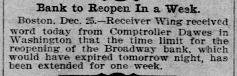 Bank to Reopen In a Week. Boston, Dec. 25.-Receiver Wing received word today from Comptroller Dawes in Washington that the time limit for the reopening of the Broadway bank, which would have expired tomorrow night, has been extended for one week.