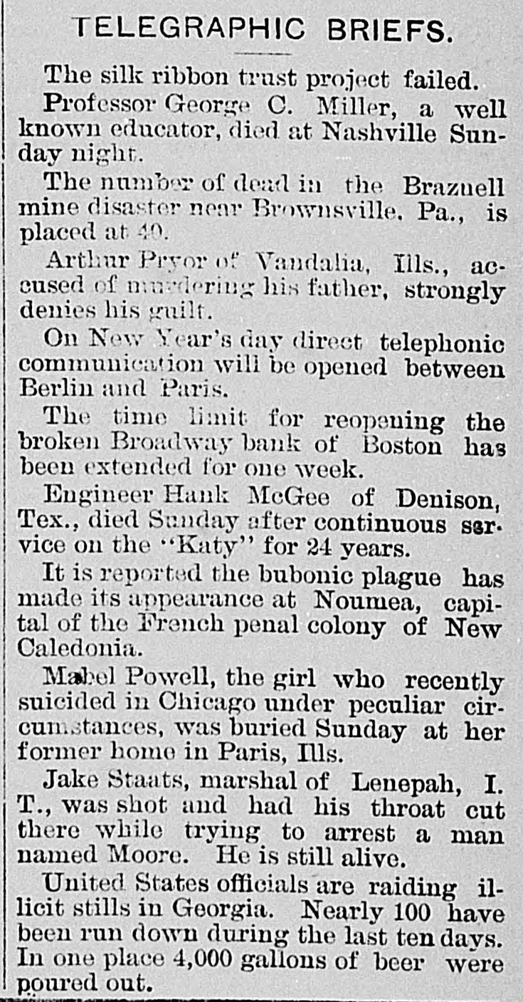 TELEGRAPHIC BRIEFS. The silk ribbon trust project failed. Professor George C. Miller, a well known educator, died at Nashville Sunday night. The number of dead in the Brazuell mine disaster near Brownsville, Pa., is placed at 40. Arthur Pryor of Vandalia, Ills., accused of musdering his father, strongly denies his guilt. On New Year's day direct telephonic communication will be opened between Berlin and Paris. The time limit for reopening the broken Broadway bank of Boston has been extended for one week. Engineer Hank McGee of Denison, Tex., died Sunday after continuous sar. vice on the "Katy" for 24 years. It is reported the bubonic plague has made its appearance at Noumea, capital of the French penal colony of New Caledonia. Mabel Powell, the girl who recently suicided in Chicago under peculiar circumstances, was buried Sunday at her former home in Paris, Ills. Jake Staats, marshal of Lenepah, I. T., was shot and had his throat cut there while trying to arrest a man named Moore. He is still alive. United States officials are raiding illicit stills in Georgia. Nearly 100 have been run down during the last ten days. In one place 4,000 gallons of beer were poured out.