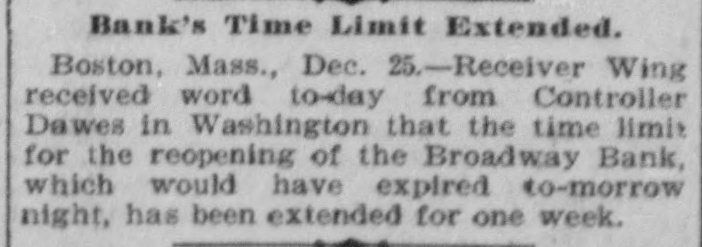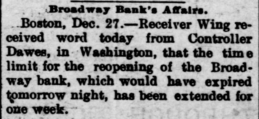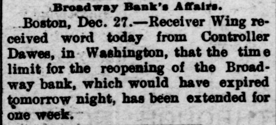 Broadway Bank's Affairs. Boston, Dec. 27.-Receiver Wing received word today from Controller Dawes, in Washington, that the tim e limit for the reopening of the Broadway bank, which would have expired tomorrow night, has been extended for one week.