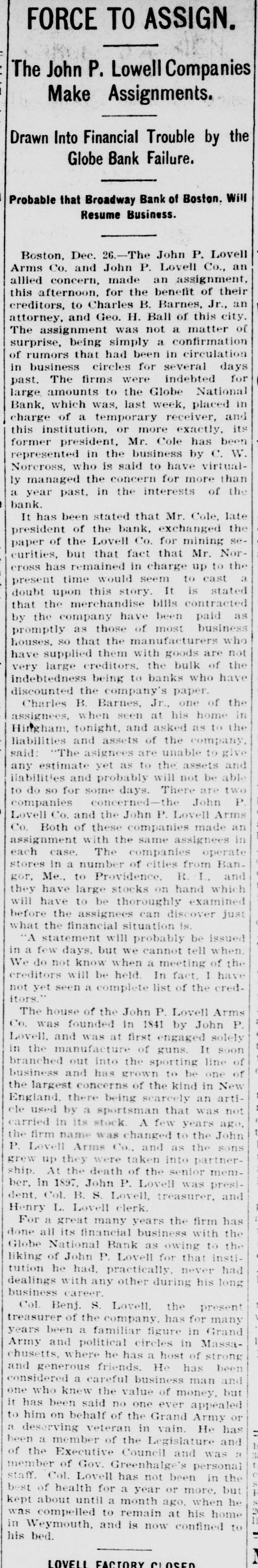 FORCE TO ASSIGN. The John P. Lowell Companies Make Assignments. Drawn Into Financial Trouble by the Globe Bank Failure. Probable that Broadway Bank of Boston. Will Resume Business. Boston, Dec. 26.-The John P. Lovell Arms Co. and John P. Lovell Co., an allied concern, made an assignment, this afternoon, for the benefit of their creditors, to Charles B. Barnes, Jr., an attorney, and Geo. H. Ball of this city. The assignment was not a matter of surprise, being simply a confirmation of rumors that had been in circulation - doun