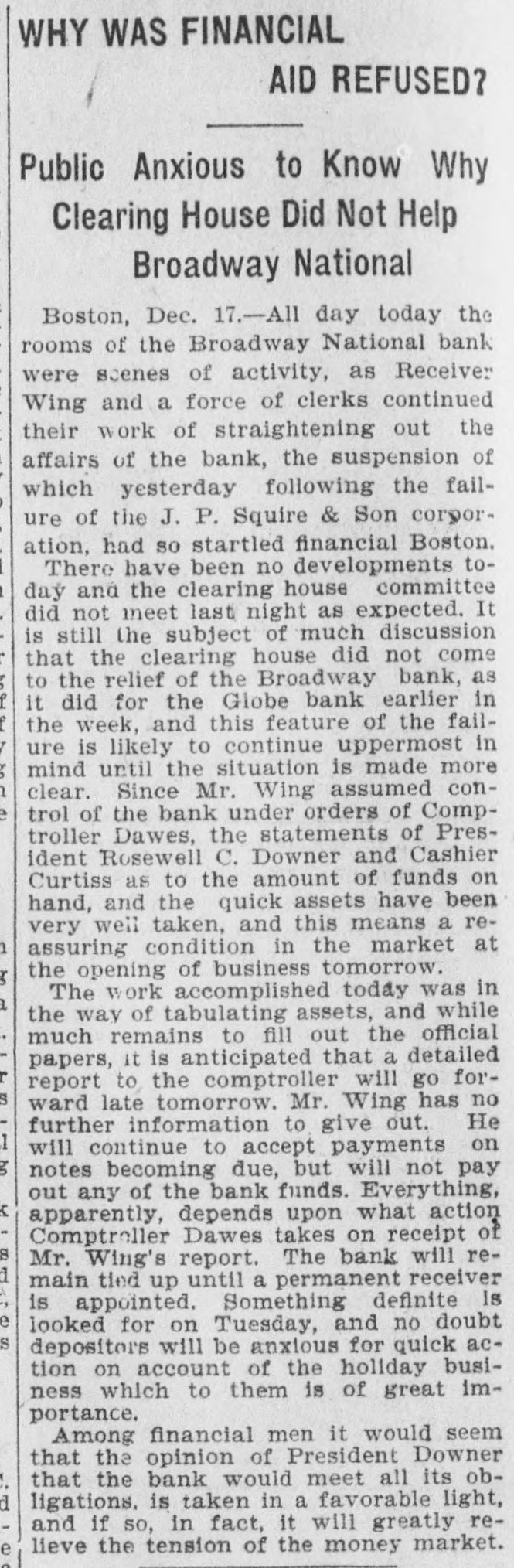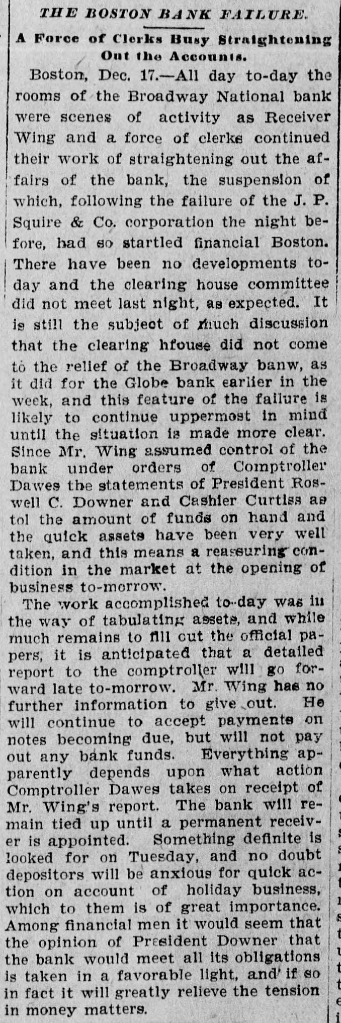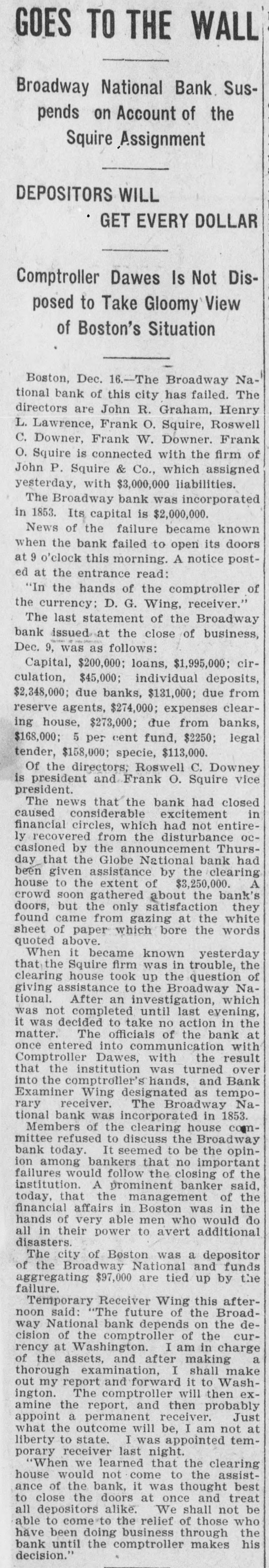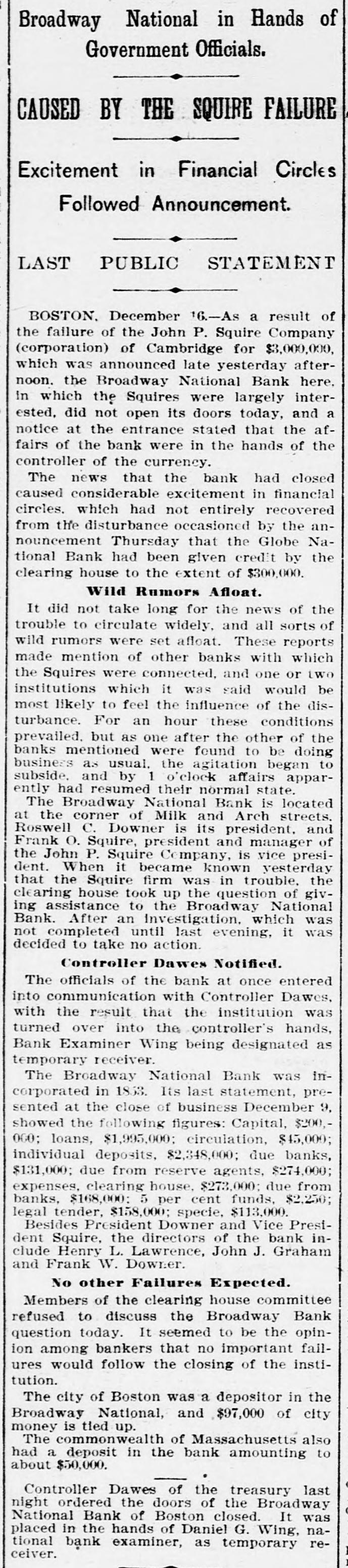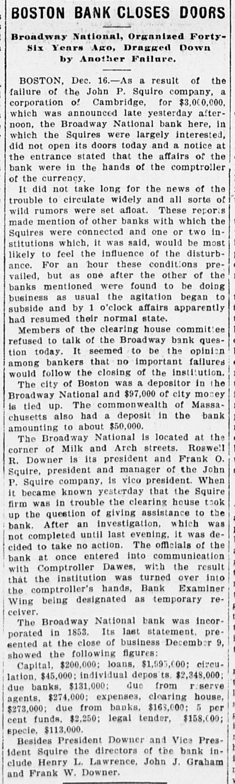 Broadway National in Hands of Government Officials. BY FAILURE CAUSED SQUIRE Excitement in Financial Circles Followed Announcement. LAST PUBLIC STATEMENT BOSTON. December 16.-As a result of the failure of the John P. Squire Company (corporation) of Cambridge for $3,000,000, which was announced late yesterday afternoon. the Broadway National Bank here. in which the Squires were largely interested, did not open its doors today, and a notice at the entrance stated that the affairs of the bank were in the hands of the controller of the currency. The news that the bank had closed caused considerable excitement in financial circles, which had not entirely recovered from the disturbance occasioned by the announcement Thursday that the Globe National Bank had been given credit by the clearing house to the extent of $300,000. Wild Rumors Afloat. It did not take long for the news of the trouble to circulate widely, and all sorts of wild rumors were set afloat. These reports made mention of other banks with which the Squires were connected, and one or two institutions which it was said would be most likely to feel the influence of the disturbance. For an hour these conditions prevailed. but as one after the other of the banks mentioned were found to be doing business as usual. the agitation began to subside. and by 1 o'clock affairs apparently had resumed their normal state. The Broadway National Bank is located at the corner of Milk and Arch streets. Roswell C. Downer is its president. and Frank O. Squire, president and manager of the John P. Squire Company, is vice president. When it became known yesterday that the Squire firm was in trouble. the clearing house took up the question of giving assistance to the Broadway National Bank. After an investigation, which was not completed until last evening. it was decided to take no action. Controller Dawes Notified. The officials of the bank at once entered into conmunication with Controller Dawes, with the result that the institution was turned over into the controller's hands, Bank Examiner Wing being designated as temporary receiver. The Broadway National Bank was incorporated in 1853. Its last statement, presented at the close of business December 9, showed the following figures: Capital, $200.000: loans, $1,995,000; circulation, $45,000; individual deposits, $2,348,000; due banks, $131,000; due from reserve agents, $274,000; expenses, clearing house. $273,000; due from banks, $168,000: 5 per cent funds, $2,250; legal tender, $158,000; specie, $113,000. Besides President Downer and Vice Prestdent Squire, the directors of the bank include Henry L. Lawrence, John J. Graham and Frank W. Downer. No other Failures Expected. Members of the clearing house committee refused to discuss the Broadway Bank question today. It seemed to be the opinion among bankers that no important failures would follow the closing of the institution. The city of Boston was a depositor in the Broadway National, and $97,000 of city money is tied up. The commonwealth of Massachusetts also had a deposit in the bank amounting to about $50,000. Controller Dawes of the treasury last night ordered the doors of the Broadway National Bank of Boston closed. It was placed in the hands of Daniel G. Wing, national bank examiner, as temporary receiver.