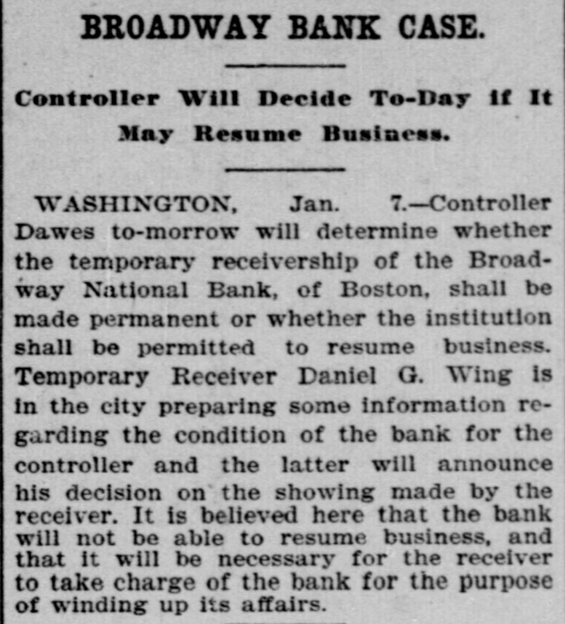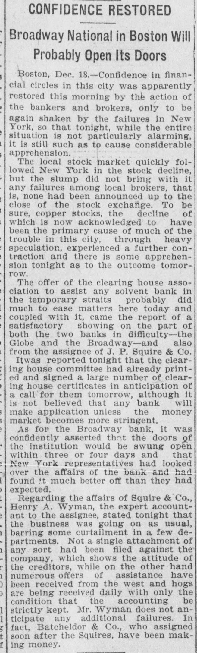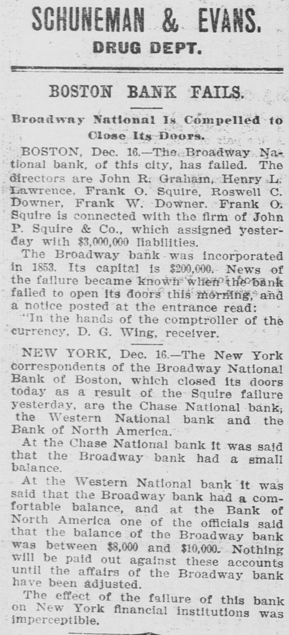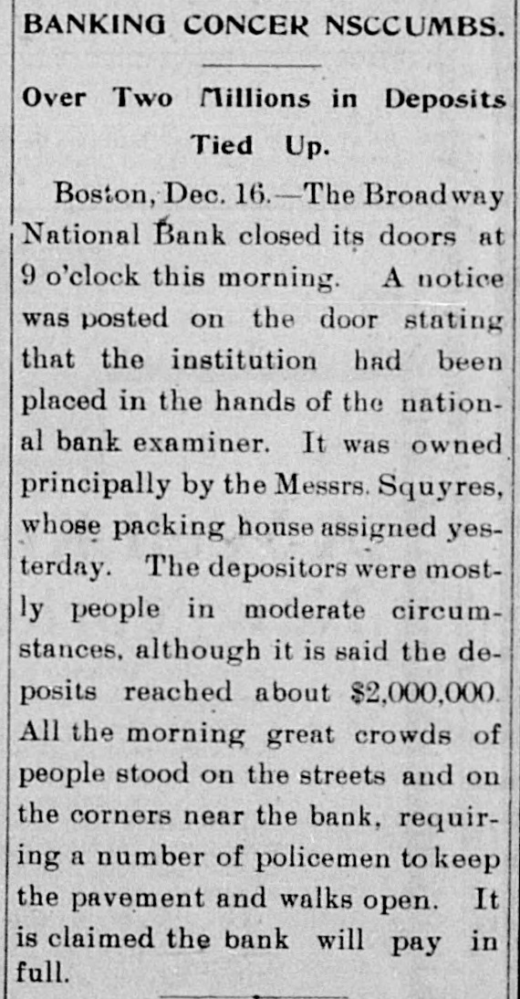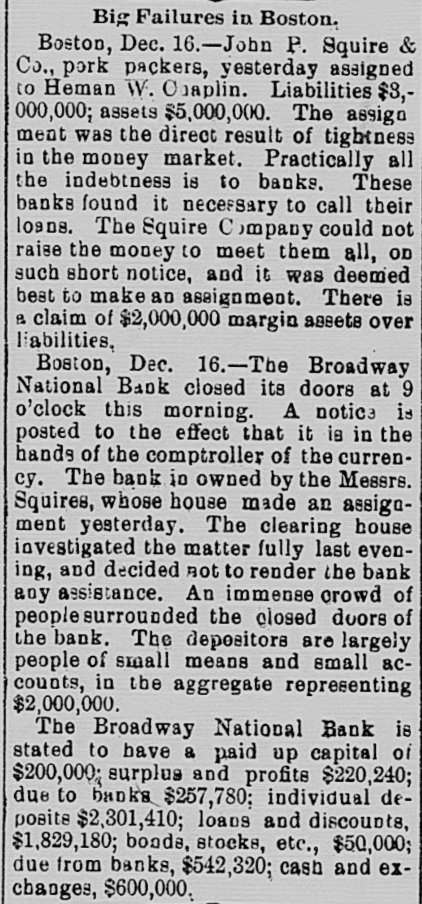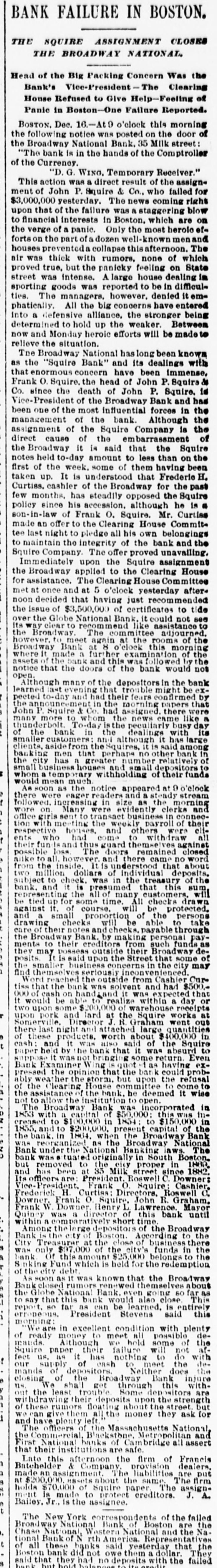 Broadway National in Hands of Government Officials. BY FAILURE CAUSED SQUIRE Excitement in Financial Circles Followed Announcement. LAST PUBLIC STATEMENT BOSTON. December 16.-As a result of the failure of the John P. Squire Company (corporation) of Cambridge for $3,000,000, which was announced late yesterday afternoon. the Broadway National Bank here. in which the Squires were largely interested, did not open its doors today, and a notice at the entrance stated that the affairs of the bank were in the hands of the controller of the currency. The news that the bank had closed caused considerable excitement in financial circles, which had not entirely recovered from the disturbance occasioned by the announcement Thursday that the Globe National Bank had been given credit by the clearing house to the extent of $300,000. Wild Rumors Afloat. It did not take long for the news of the trouble to circulate widely, and all sorts of wild rumors were set afloat. These reports made mention of other banks with which the Squires were connected, and one or two institutions which it was said would be most likely to feel the influence of the disturbance. For an hour these conditions prevailed. but as one after the other of the banks mentioned were found to be doing business as usual. the agitation began to subside. and by 1 o'clock affairs apparently had resumed their normal state. The Broadway National Bank is located at the corner of Milk and Arch streets. Roswell C. Downer is its president. and Frank O. Squire, president and manager of the John P. Squire Company, is vice president. When it became known yesterday that the Squire firm was in trouble. the clearing house took up the question of giving assistance to the Broadway National Bank. After an investigation, which was not completed until last evening. it was decided to take no action. Controller Dawes Notified. The officials of the bank at once entered into conmunication with Controller Dawes, with the result that the institution was turned over into the controller's hands, Bank Examiner Wing being designated as temporary receiver. The Broadway National Bank was incorporated in 1853. Its last statement, presented at the close of business December 9, showed the following figures: Capital, $200.000: loans, $1,995,000; circulation, $45,000; individual deposits, $2,348,000; due banks, $131,000; due from reserve agents, $274,000; expenses, clearing house. $273,000; due from banks, $168,000: 5 per cent funds, $2,250; legal tender, $158,000; specie, $113,000. Besides President Downer and Vice Prestdent Squire, the directors of the bank include Henry L. Lawrence, John J. Graham and Frank W. Downer. No other Failures Expected. Members of the clearing house committee refused to discuss the Broadway Bank question today. It seemed to be the opinion among bankers that no important failures would follow the closing of the institution. The city of Boston was a depositor in the Broadway National, and $97,000 of city money is tied up. The commonwealth of Massachusetts also had a deposit in the bank amounting to about $50,000. Controller Dawes of the treasury last night ordered the doors of the Broadway National Bank of Boston closed. It was placed in the hands of Daniel G. Wing, national bank examiner, as temporary receiver.