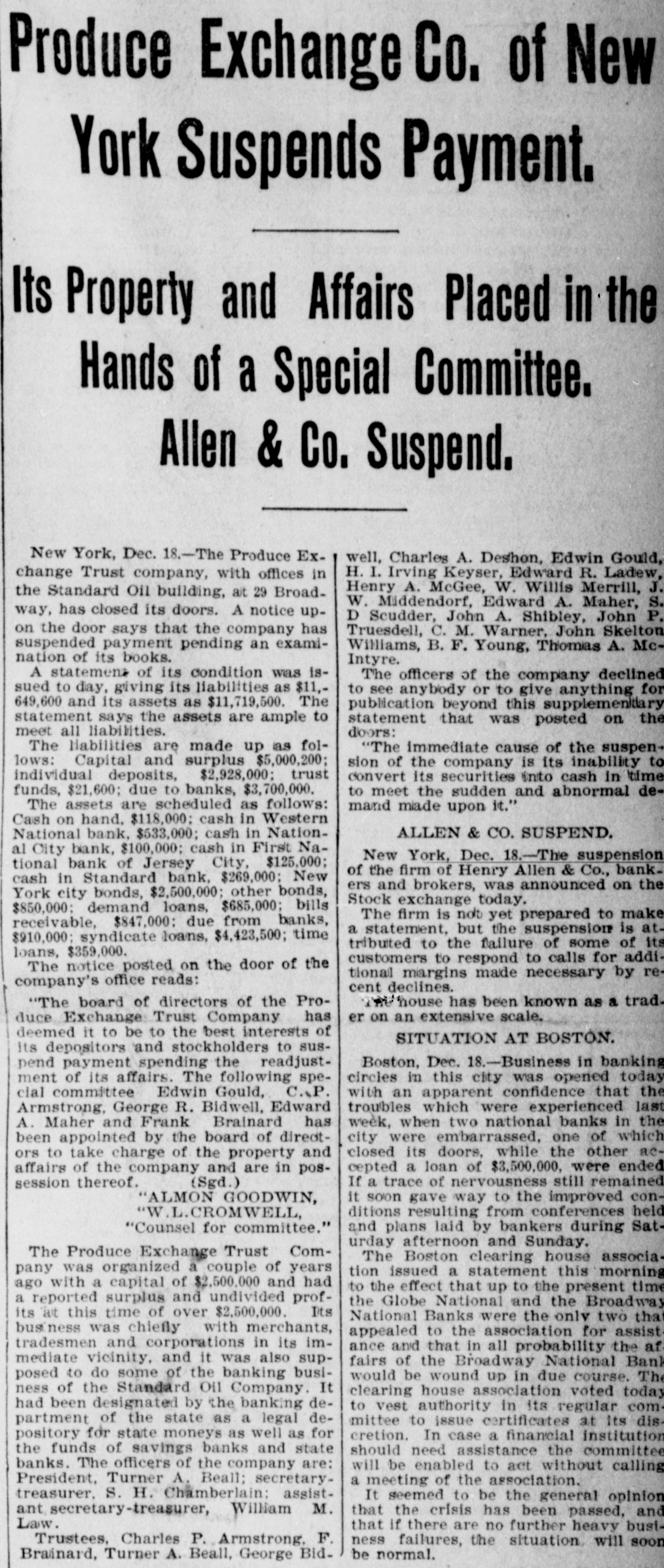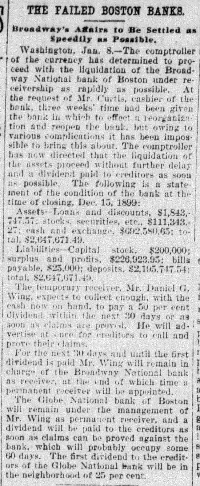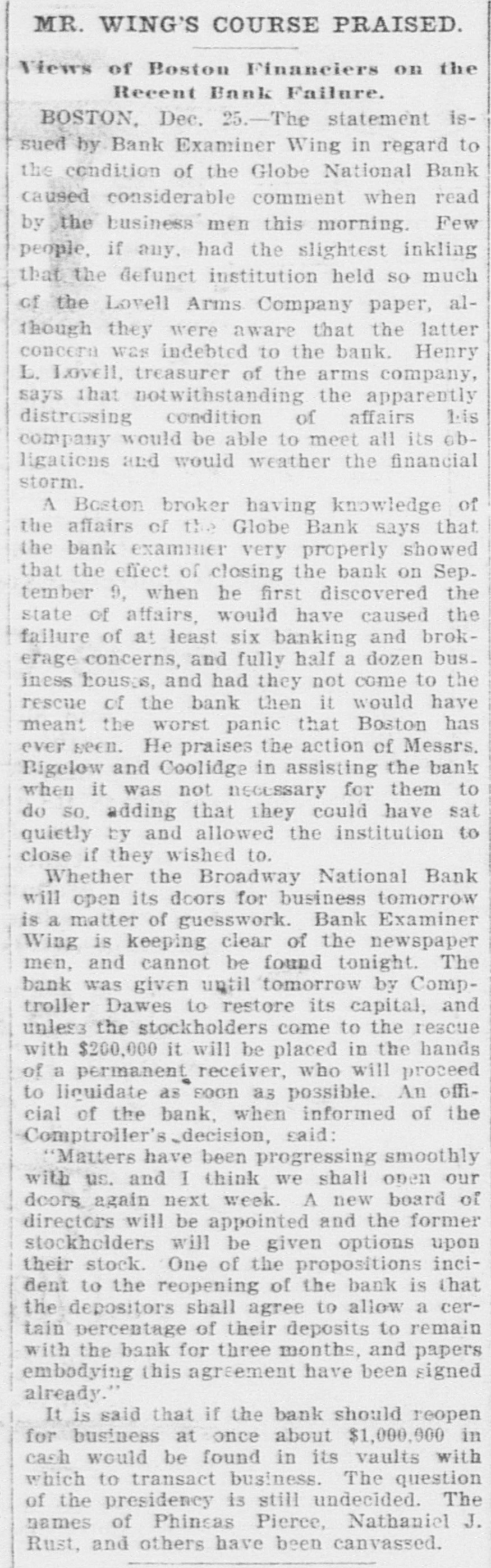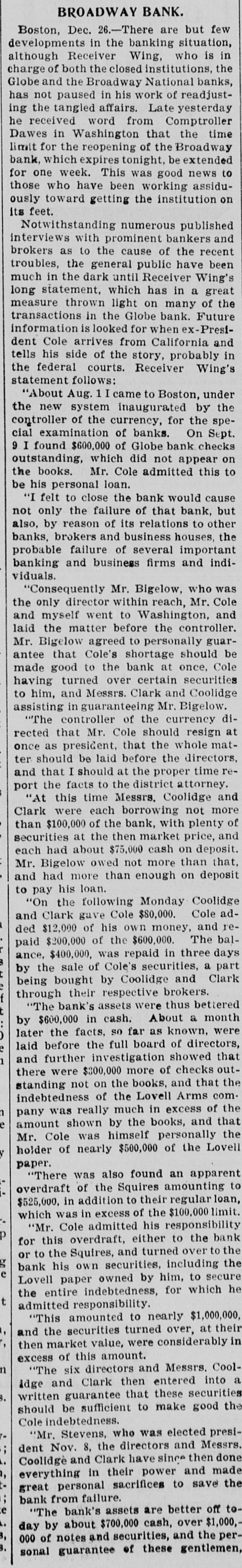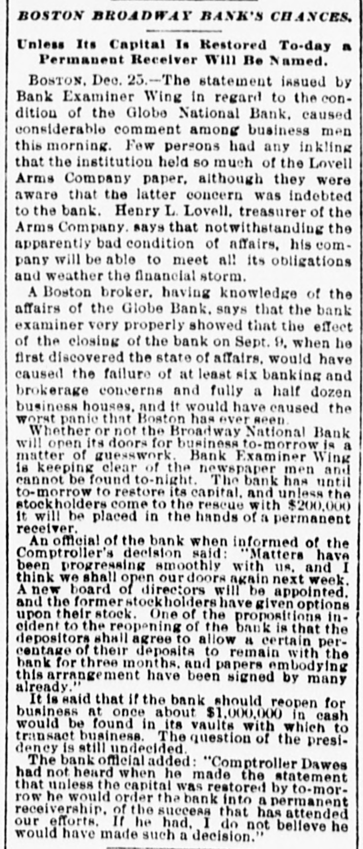 Broadway National in Hands of Government Officials. BY FAILURE CAUSED SQUIRE Excitement in Financial Circles Followed Announcement. LAST PUBLIC STATEMENT BOSTON. December 16.-As a result of the failure of the John P. Squire Company (corporation) of Cambridge for $3,000,000, which was announced late yesterday afternoon. the Broadway National Bank here. in which the Squires were largely interested, did not open its doors today, and a notice at the entrance stated that the affairs of the bank were in the hands of the controller of the currency. The news that the bank had closed caused considerable excitement in financial circles, which had not entirely recovered from the disturbance occasioned by the announcement Thursday that the Globe National Bank had been given credit by the clearing house to the extent of $300,000. Wild Rumors Afloat. It did not take long for the news of the trouble to circulate widely, and all sorts of wild rumors were set afloat. These reports made mention of other banks with which the Squires were connected, and one or two institutions which it was said would be most likely to feel the influence of the disturbance. For an hour these conditions prevailed. but as one after the other of the banks mentioned were found to be doing business as usual. the agitation began to subside. and by 1 o'clock affairs apparently had resumed their normal state. The Broadway National Bank is located at the corner of Milk and Arch streets. Roswell C. Downer is its president. and Frank O. Squire, president and manager of the John P. Squire Company, is vice president. When it became known yesterday that the Squire firm was in trouble. the clearing house took up the question of giving assistance to the Broadway National Bank. After an investigation, which was not completed until last evening. it was decided to take no action. Controller Dawes Notified. The officials of the bank at once entered into conmunication with Controller Dawes, with the result that the institution was turned over into the controller's hands, Bank Examiner Wing being designated as temporary receiver. The Broadway National Bank was incorporated in 1853. Its last statement, presented at the close of business December 9, showed the following figures: Capital, $200.000: loans, $1,995,000; circulation, $45,000; individual deposits, $2,348,000; due banks, $131,000; due from reserve agents, $274,000; expenses, clearing house. $273,000; due from banks, $168,000: 5 per cent funds, $2,250; legal tender, $158,000; specie, $113,000. Besides President Downer and Vice Prestdent Squire, the directors of the bank include Henry L. Lawrence, John J. Graham and Frank W. Downer. No other Failures Expected. Members of the clearing house committee refused to discuss the Broadway Bank question today. It seemed to be the opinion among bankers that no important failures would follow the closing of the institution. The city of Boston was a depositor in the Broadway National, and $97,000 of city money is tied up. The commonwealth of Massachusetts also had a deposit in the bank amounting to about $50,000. Controller Dawes of the treasury last night ordered the doors of the Broadway National Bank of Boston closed. It was placed in the hands of Daniel G. Wing, national bank examiner, as temporary receiver.